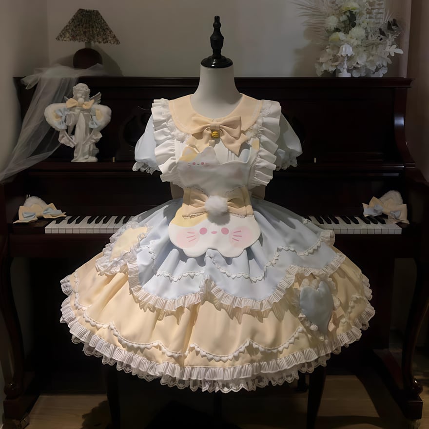 猫耳のような愛らしいカッティングが目を引く、夢見心地なパステルブルーとイエローの甘ロリドレスです。