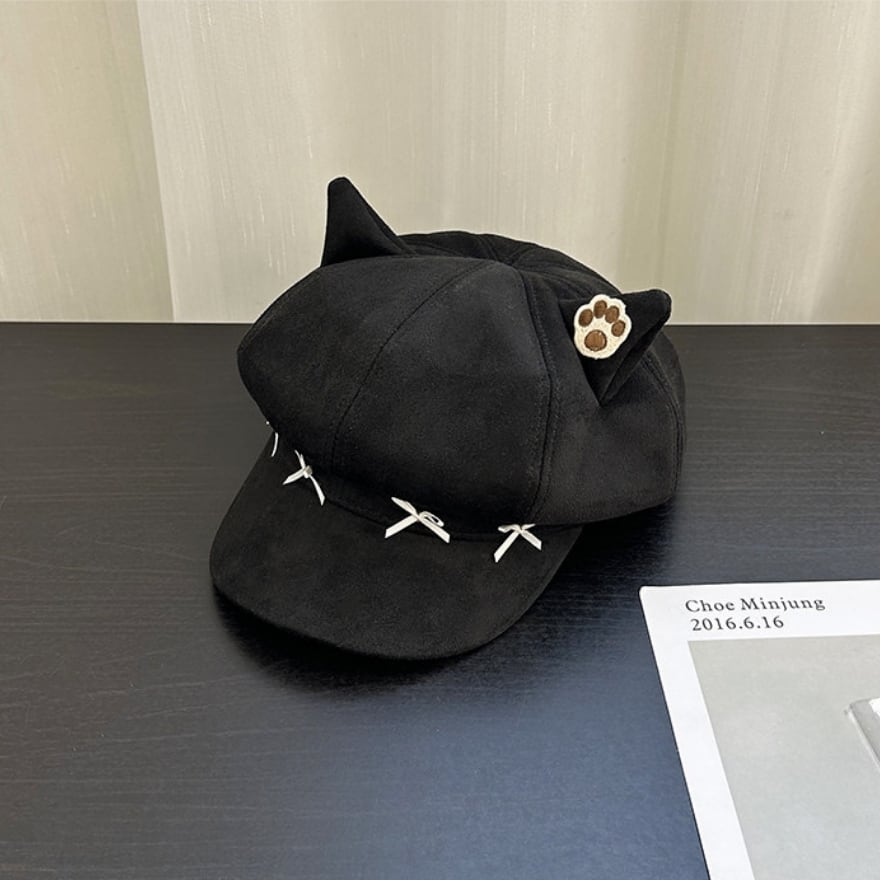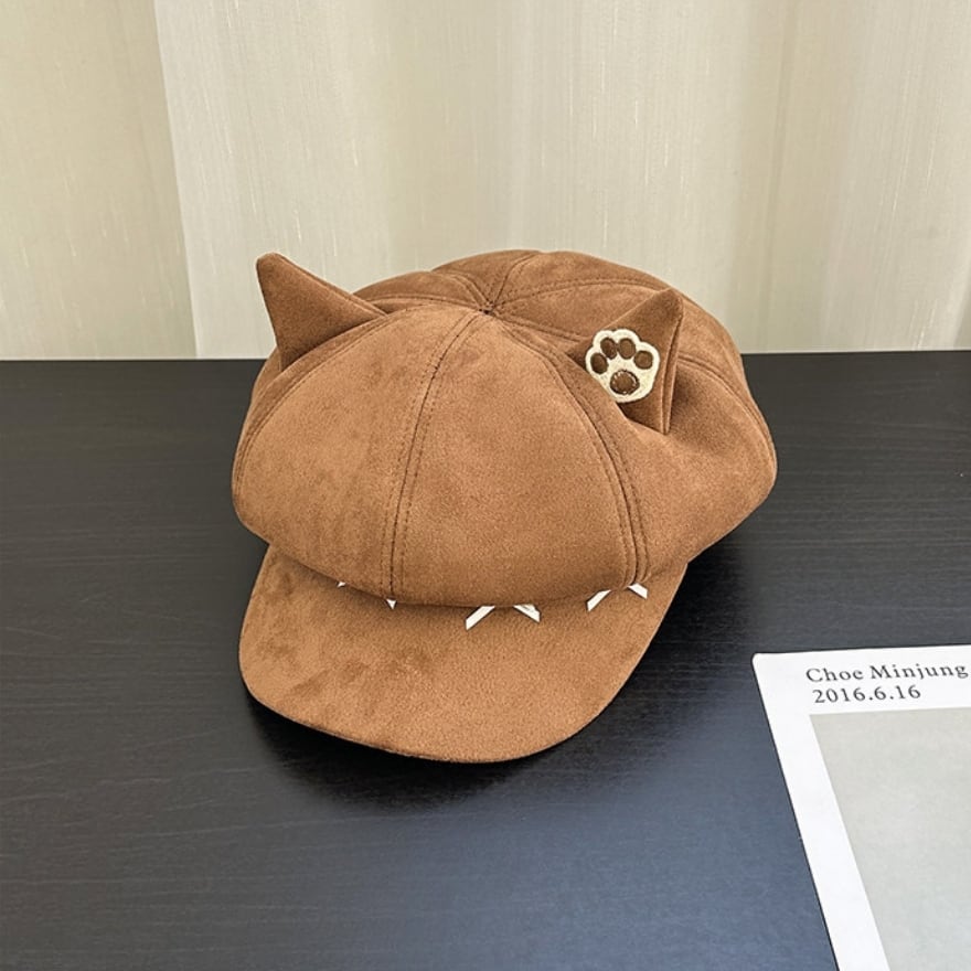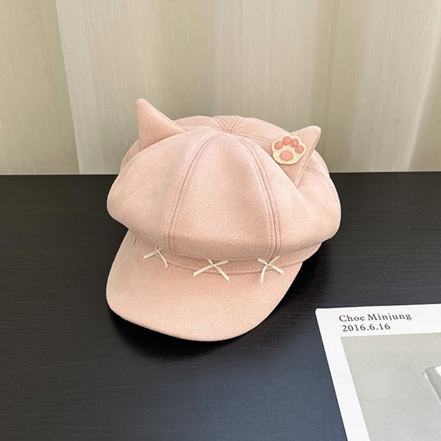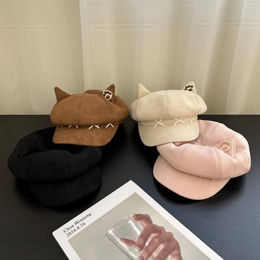 ぴょこんと飛び出した愛らしい「ねこ耳」に、肉球のワンポイント刺繍を添えた、遊び心溢れるキャスケット風の八角帽です。