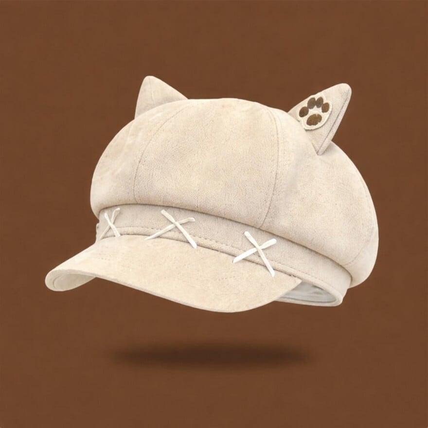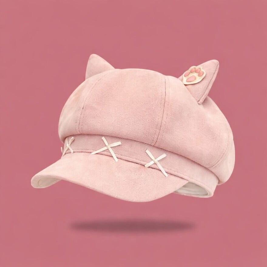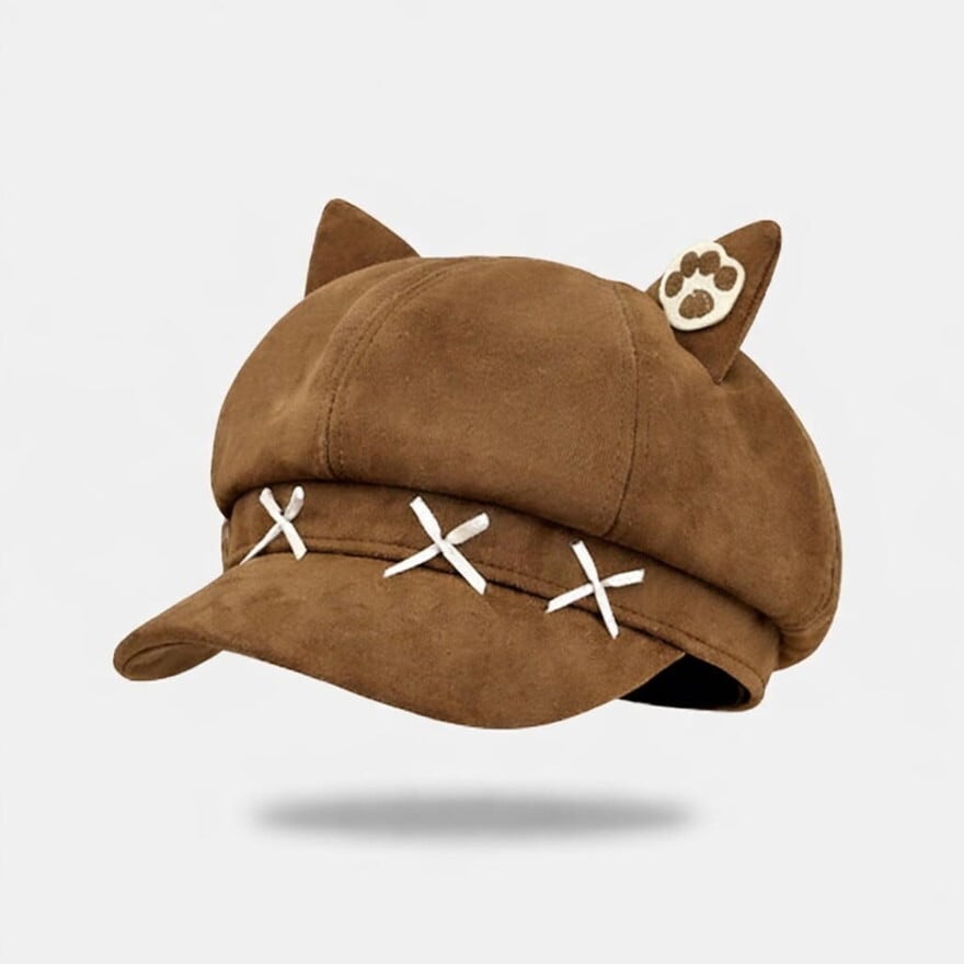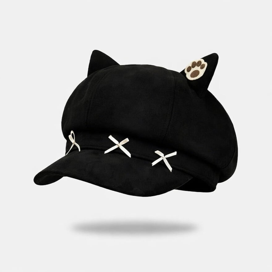 ぴょこんと飛び出した愛らしい「ねこ耳」に、肉球のワンポイント刺繍を添えた、遊び心溢れるキャスケット風の八角帽です。