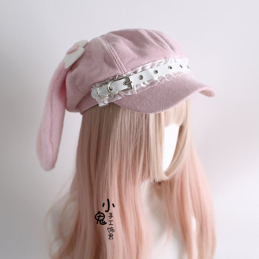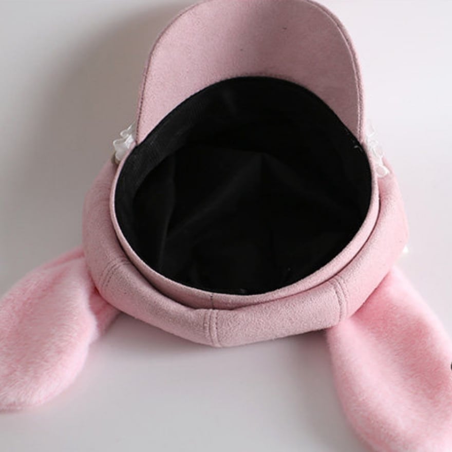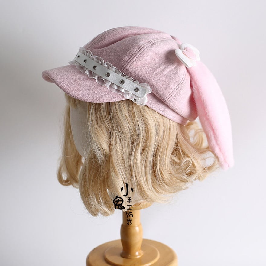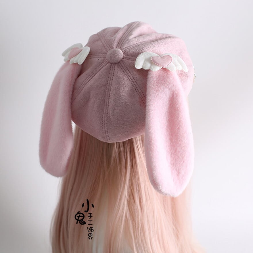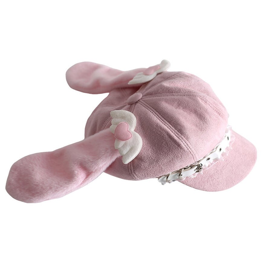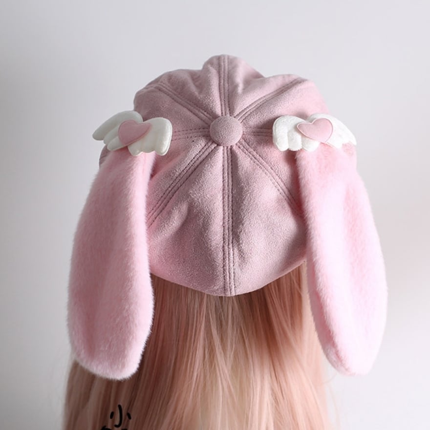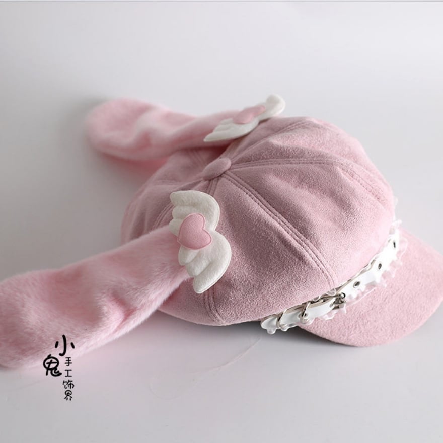 長いたれ耳に、天使の羽を思わせるハートモチーフを添えた、とびきりスウィートなピンクのキャスケット風帽子です。