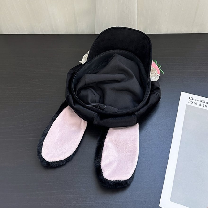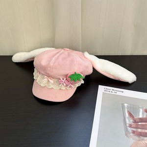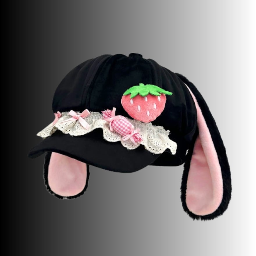 大きな垂れ耳うさぎのようなシルエットが愛らしい、いちごモチーフ付きのデコラティブなキャップです。
