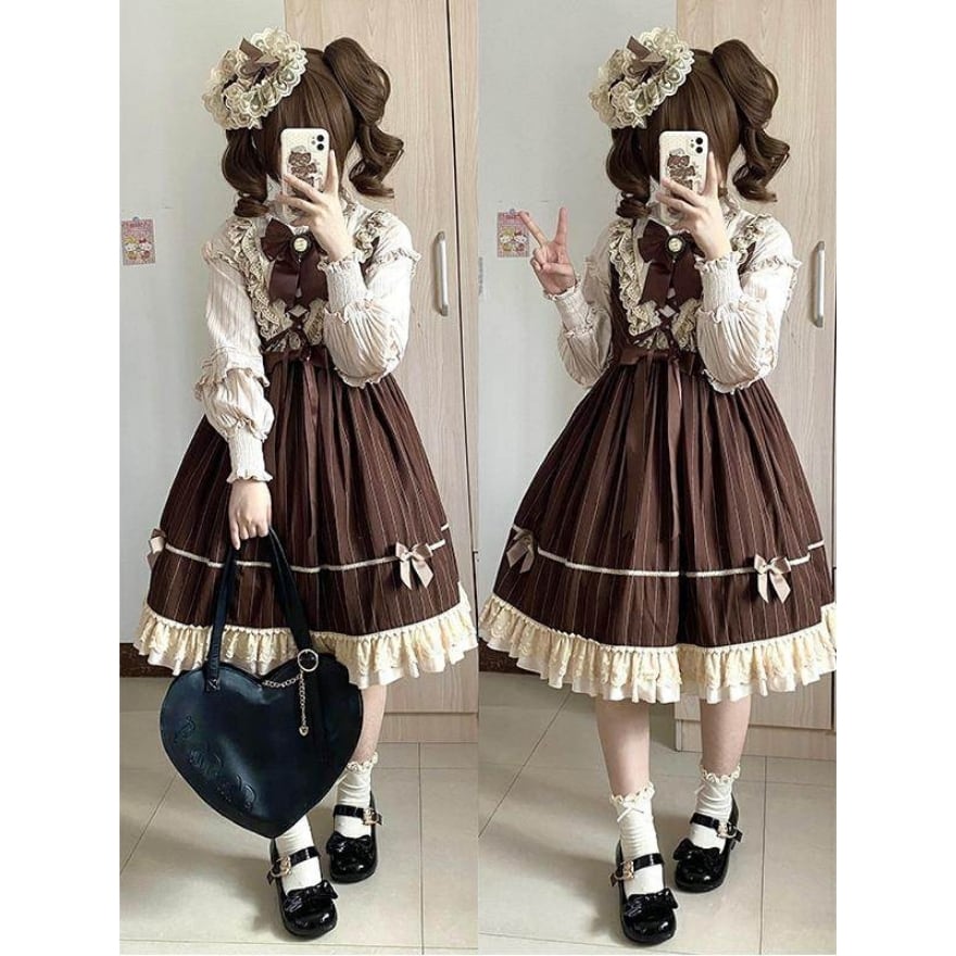 【ピンストライプ】クラシカル ロリータ ジャンパースカート|ブラウン レースアップ JSK|アンティーク調 フリル レース