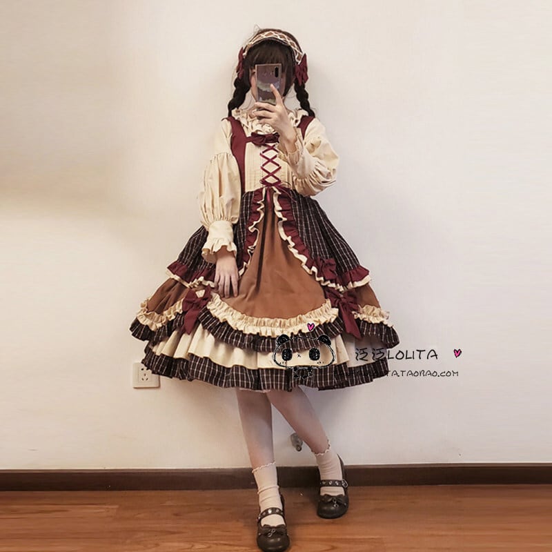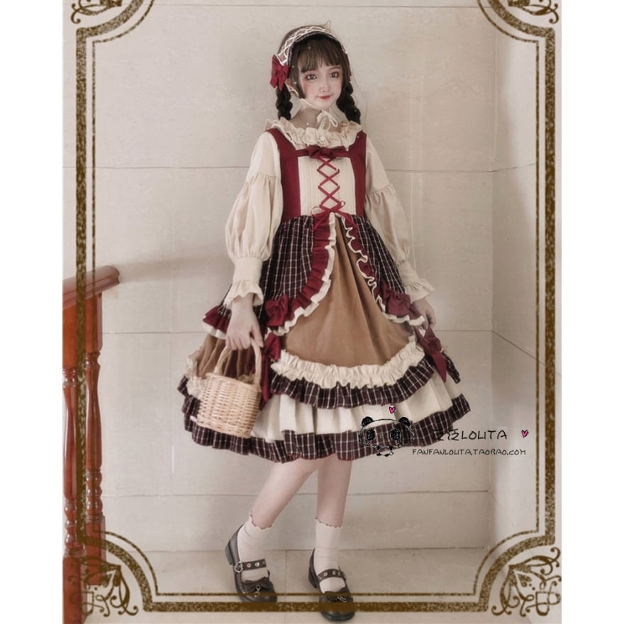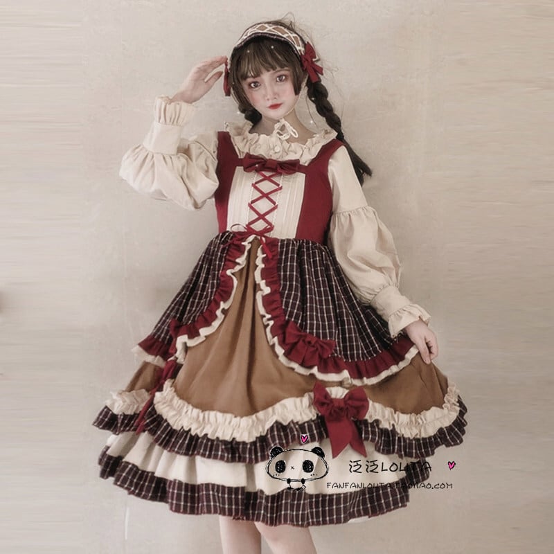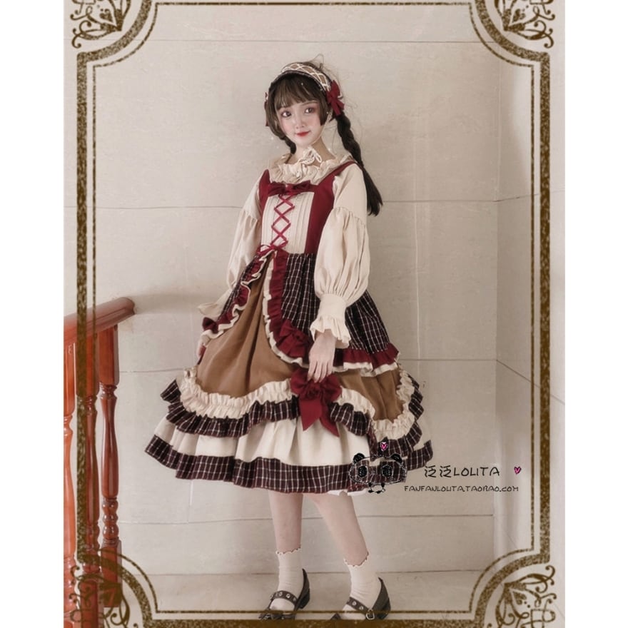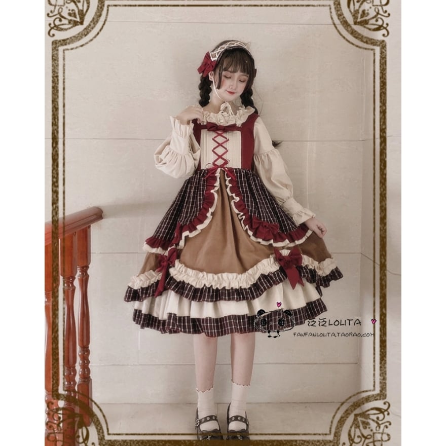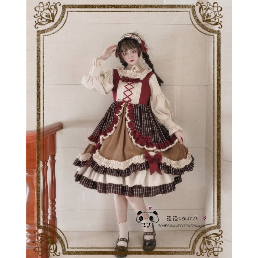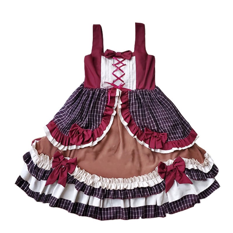 こだわりの【5段重ねフリル】による圧倒的ボリューム感が特徴。ボルドー×ブラウンのクラシカルな【多色使いチェック柄】を採用し、フロントには調節可能な【レースアップデザイン】を配置しました。