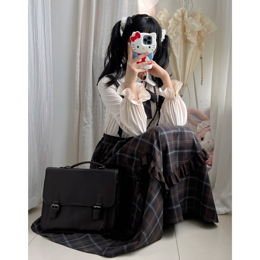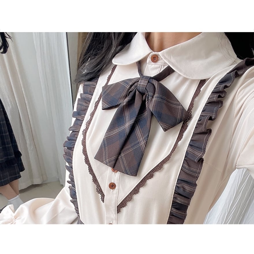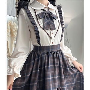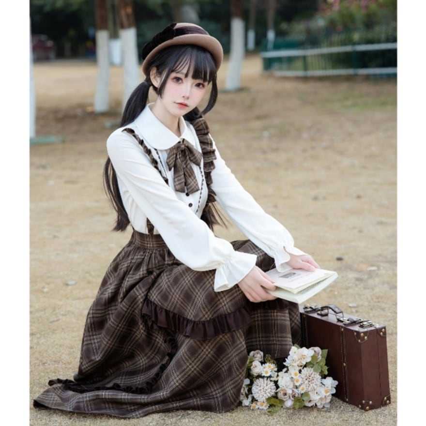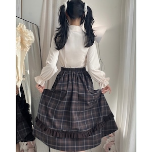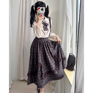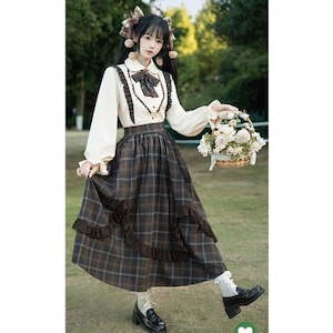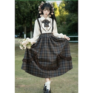上下セット仕様のため、着るだけで統一感のあるクラシカルロリータコーデが完成します。落ち着いたチェック柄と控えめなフリル装飾により、甘くなりすぎず、普段のお出かけや学生風コーデにも取り入れやすいデザインです。