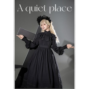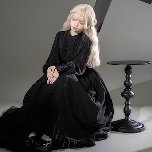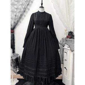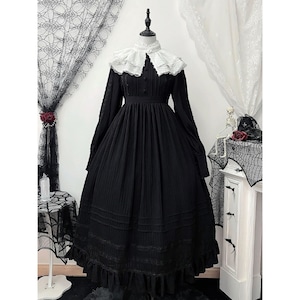 ゴシッククラシカルなレースとプリーツを重ねたロング丈ワンピース。高めのネックラインと長袖デザインが上品なゴシックロリータの世界観を演出します。