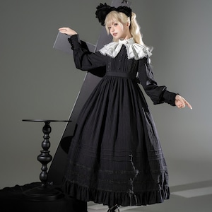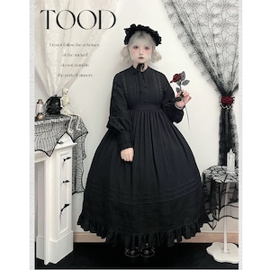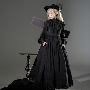 全体は黒を基調としたクラシカルなゴシックデザインです。胸元から縦に入る装飾レースと、ウエスト切替による広がりのあるスカートシルエットが特徴です。裾には段状のフリルとレースを重ね、動きに合わせて陰影が出る設計です。素材は布帛系生地が使用されていることが視認できますが、詳細な混率は画像からは不明です。
