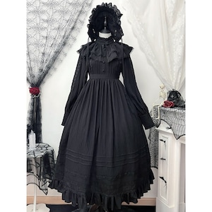 クラシカルゴシックロリータ/長袖ワンピース・付け襟・ボンネット付きセットアップ