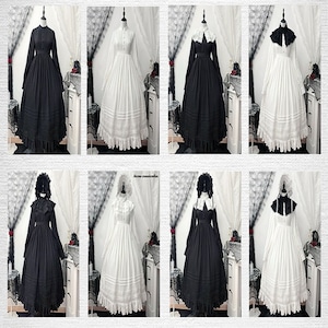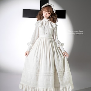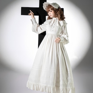 クラシカルな付け襟と繊細なプリーツが印象的なロング丈ワンピース。高めのネックラインと長袖デザインでゴシックロリータらしい気品を演出します。推し活やライブ参戦、日常コーデまで幅広く使え、ブラックとホワイトの2色から世界観に合わせて選べます。