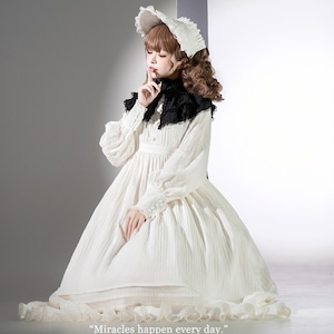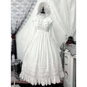 本商品は、長袖ロングワンピース・付け襟・ボンネットの3点で構成された、クラシカルロリータ向けセットアップです。