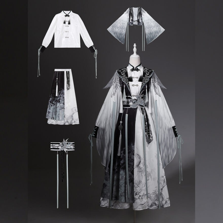 全体をホワイト×ブラックで統一し、和の刺繍と中華風の重ね袖を効果的に配置することで、チャイナゴシック×和ロリータの融合した「病み可愛い」世界観を演出する構成です。