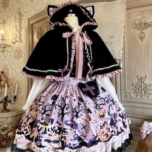 黒×ラベンダーの落ち着いた配色に、ハロウィンモチーフと猫耳ケープを組み合わせた、初心者にも取り入れやすい「ゴシックロリィタ」3点セットです。