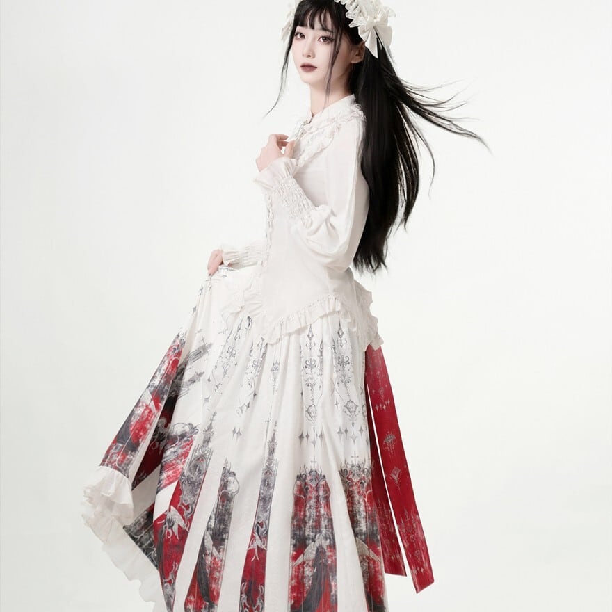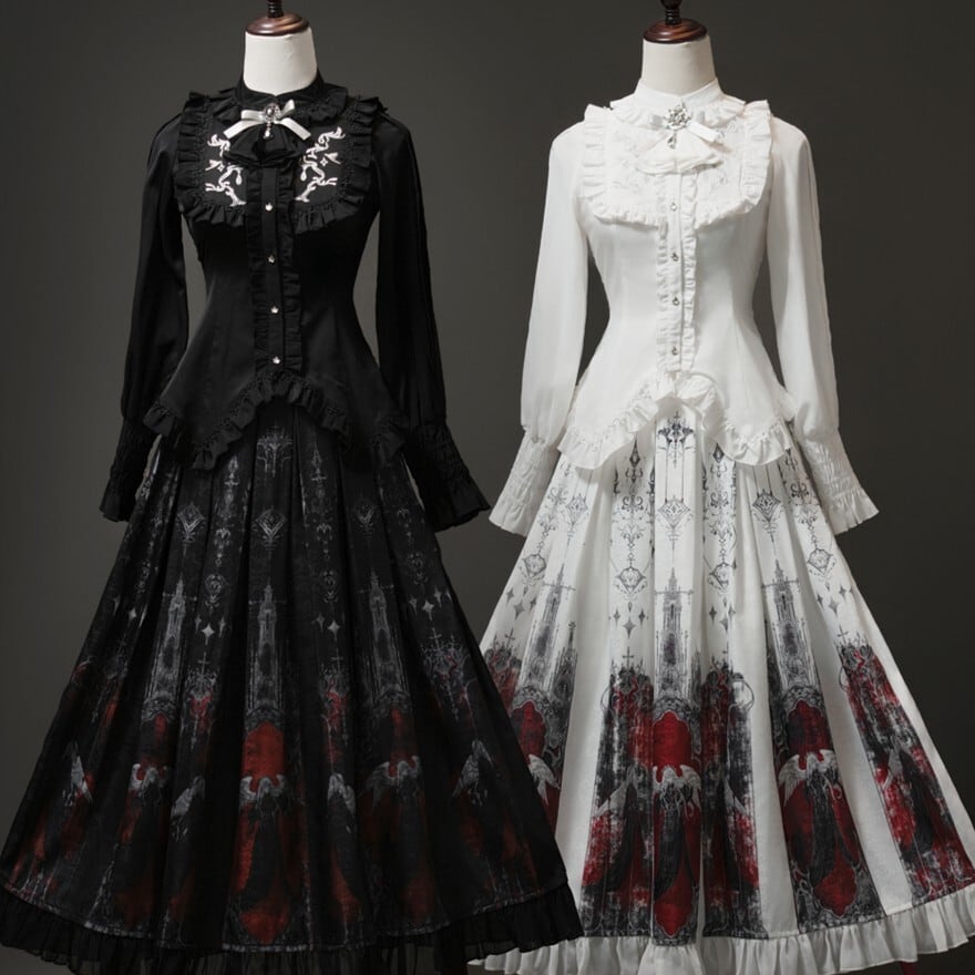 「コーデに悩む時間がもったいない」その悩み、このセットアップが解決。袖を通した瞬間、教会の静寂に包まれる。ブラウスのフリルが首元で揺れ、スカートの大聖堂プリントが足元で輝く。白なら天使の清楚さ、黒なら悪魔の妖艶さ。上下揃った完璧コーデで、お茶会の主役に