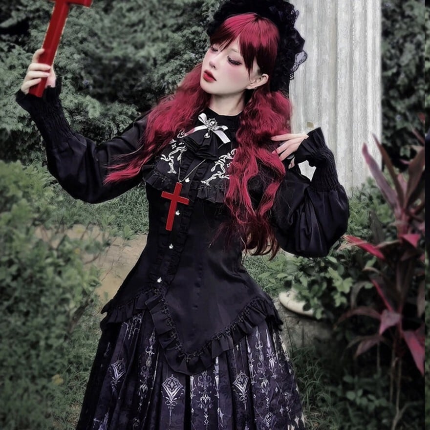 闇の大聖堂で祈りを捧げる。教会×十字架が織りなす完璧セットアップ【ブラウス+スカート/白黒2色】