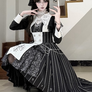 ゴシックロリィタ ワンピース+付け襟+ウエストチェーン+背中取り外し可能ウエストベルト+付け襟チェーン+腕章