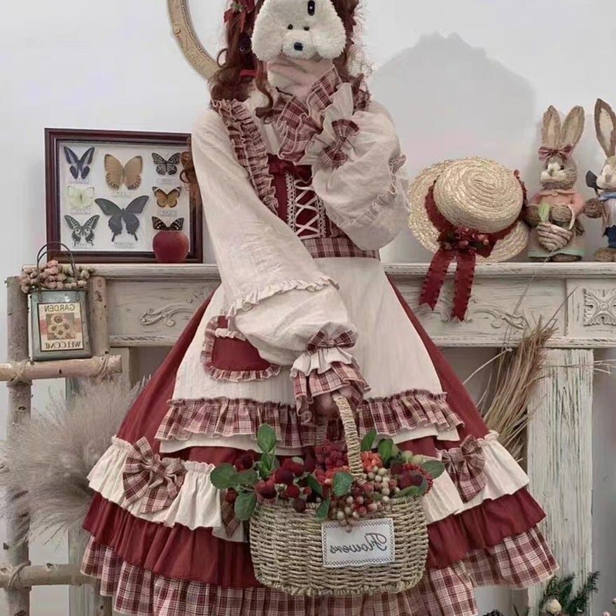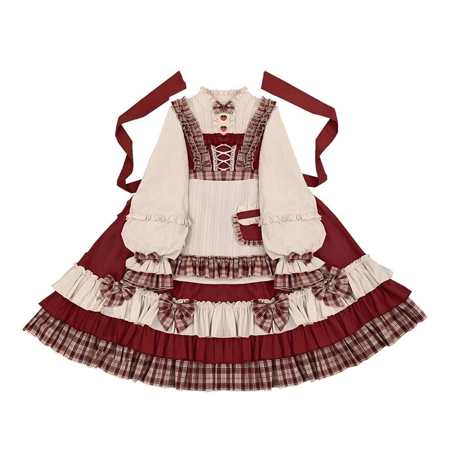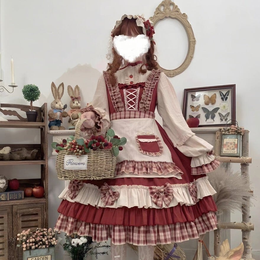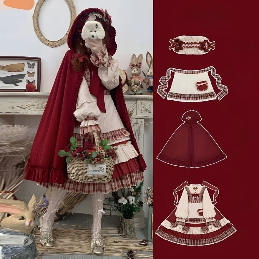 赤を基調としたクラシカルな配色が印象的なロリィタ向け四点セット。フリルを重ねたワンピースに、同色系のケープ、エプロン、ヘッドドレスを組み合わせる構成で、物語性のある統一コーディネートが完成する。光沢を抑えた布帛素材が確認でき、甘さと落ち着きを兼ね備えたデザインとなっている。