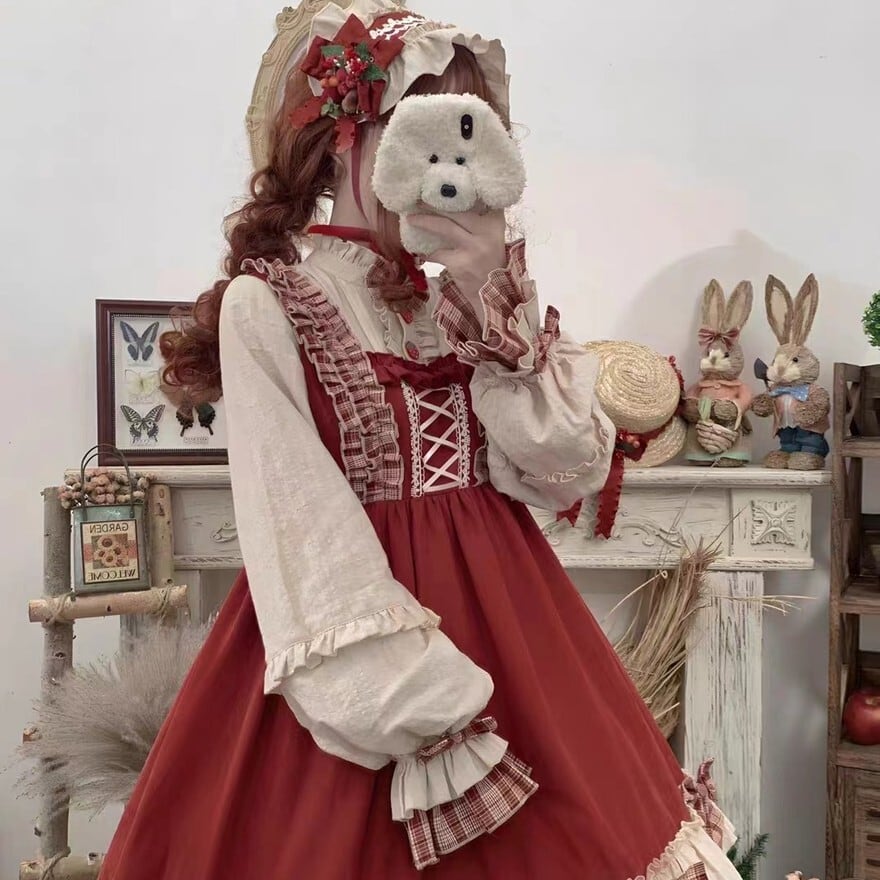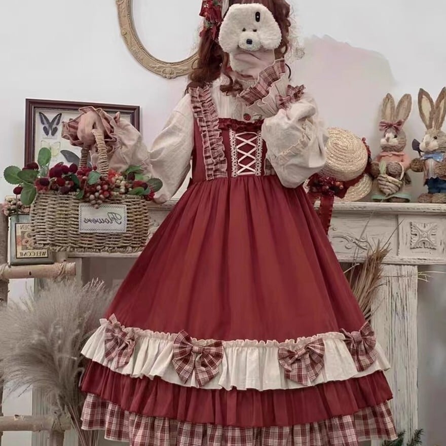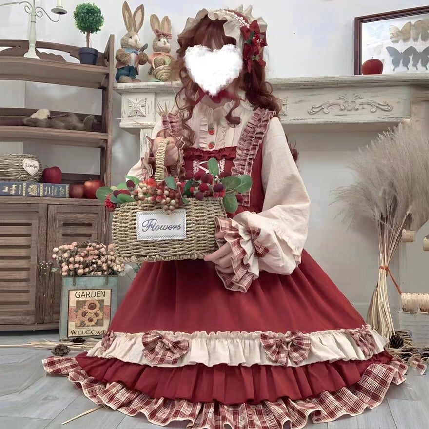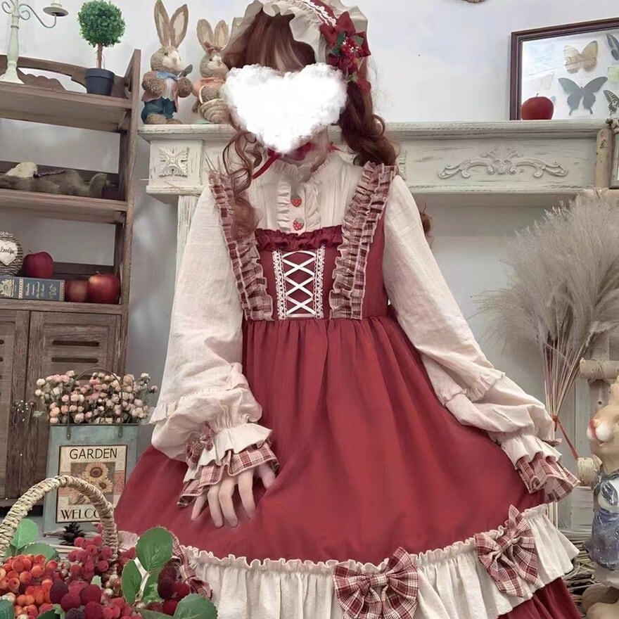 赤を基調としたクラシカルな配色が印象的なロリィタ向け四点セット。フリルを重ねたワンピースに、同色系のケープ、エプロン、ヘッドドレスを組み合わせる構成で、物語性のある統一コーディネートが完成する。光沢を抑えた布帛素材が確認でき、甘さと落ち着きを兼ね備えたデザインとなっている。