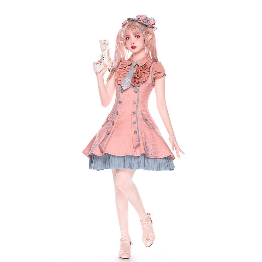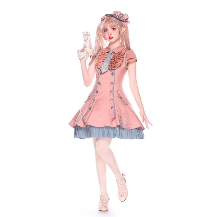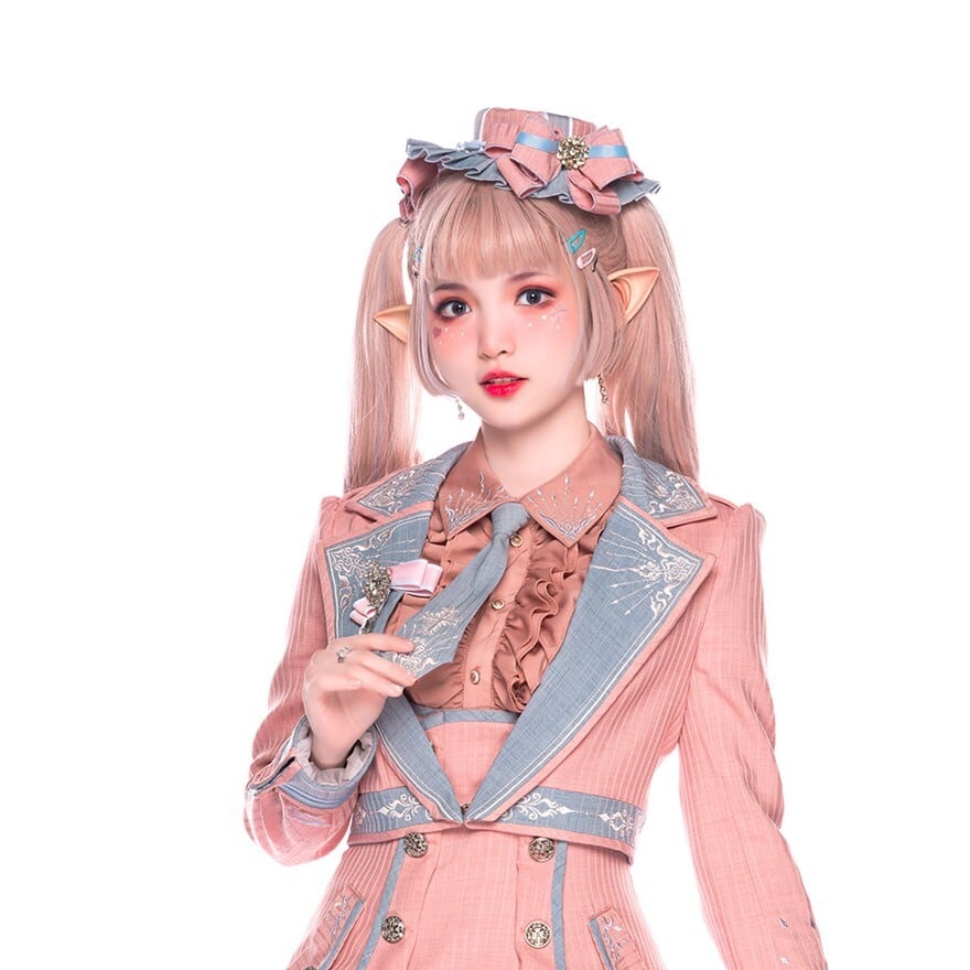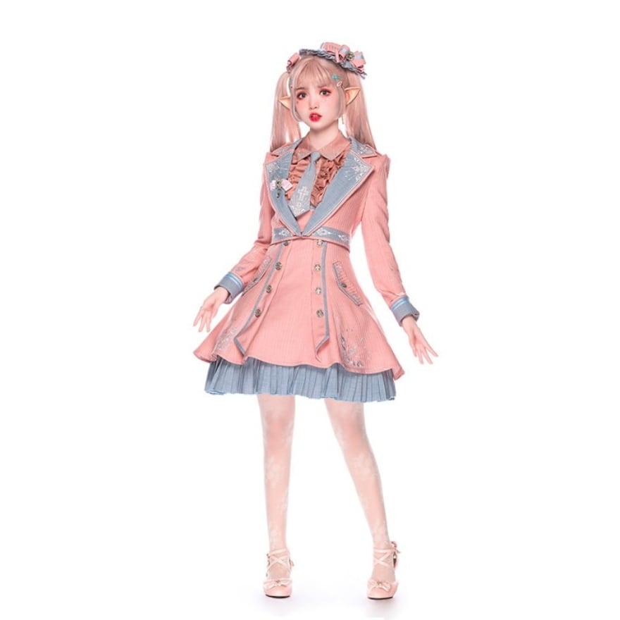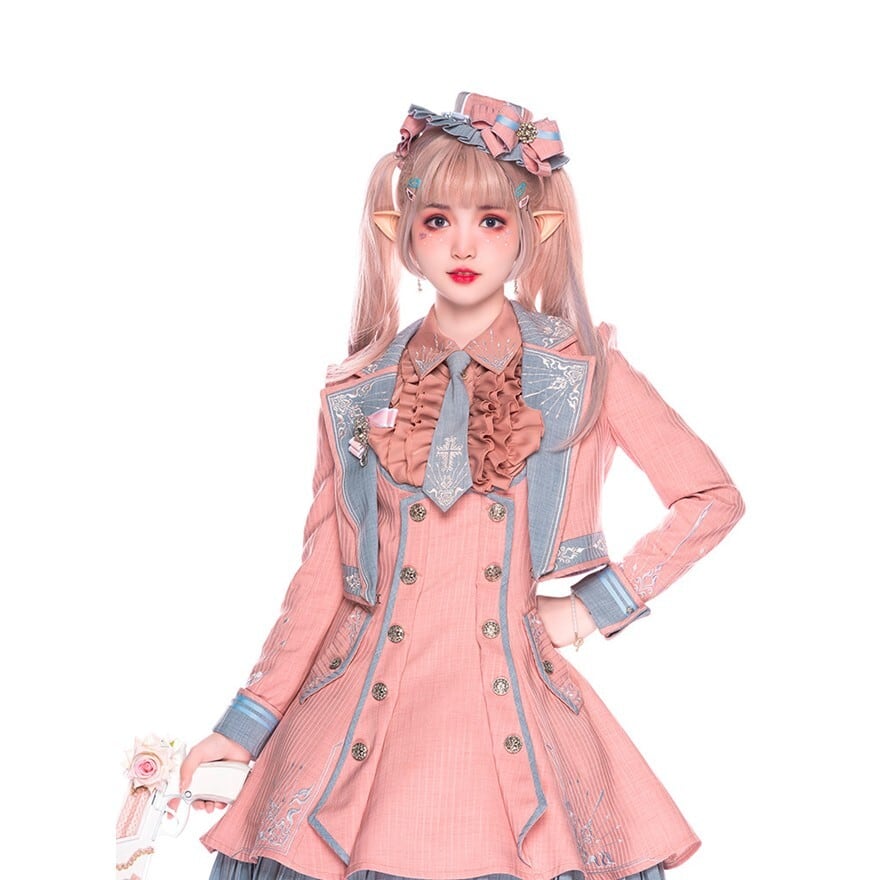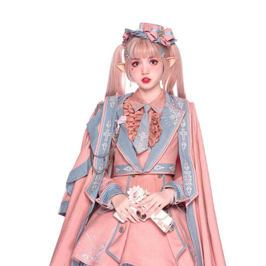 甘美なピンクに軍装の気高さを添えた、ミリタリーロリータのセットアップ。繊細なクロス刺繍が輝くジャケットと、美しい広がりを見せるJSKが、あなたを異世界のヒロインへと変貌させます。クラシカルな装飾と現代的なシルエットが融合した、特別な一日の主役にふさわしい究極の一着です。