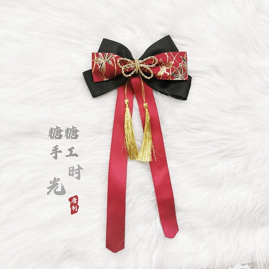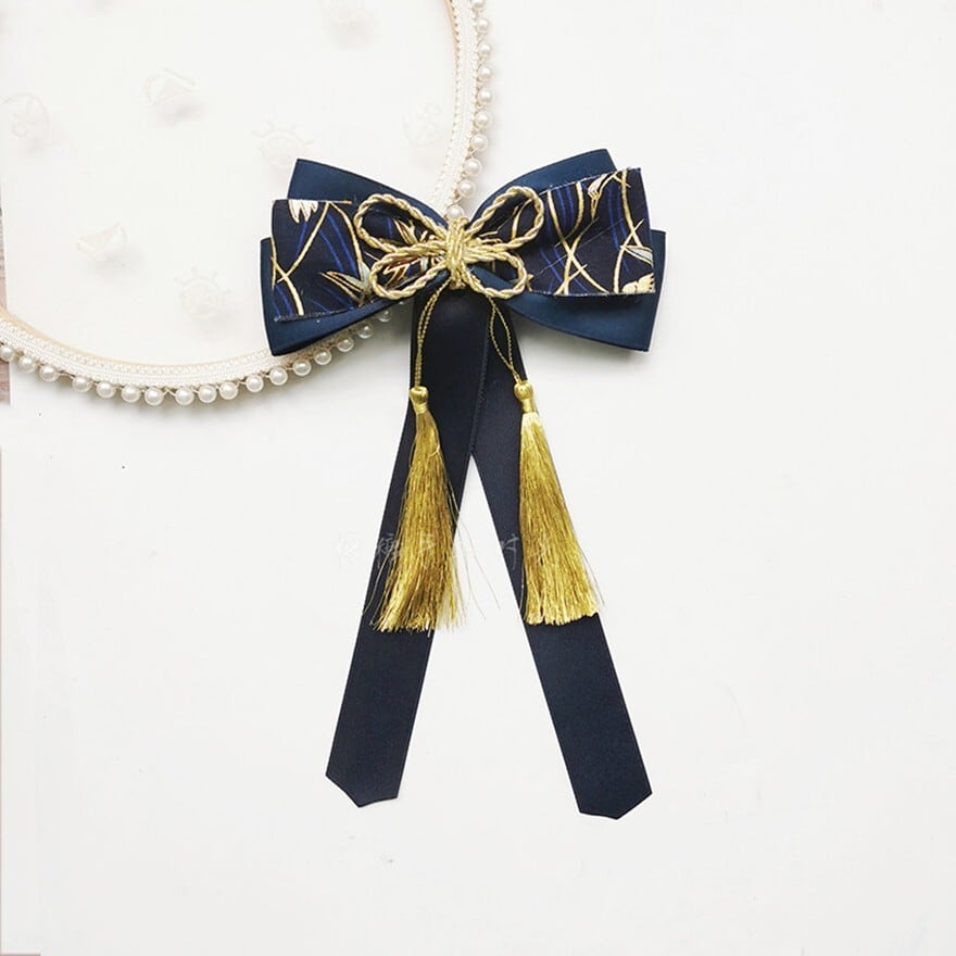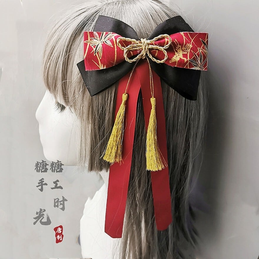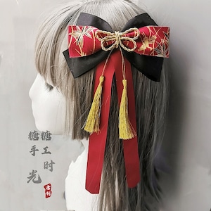 伝統的な和柄に、艶やかなゴールドの飾り紐と長めのタッセルを添えた、存在感溢れるヘアリボンです。卒業式の袴や成人式の振袖、和風ロリータファッションのアクセントに最適。クリップ式で着脱も簡単です。職人の手仕事を感じる繊細なデザインが、特別な日の装いをさらに美しく、品良く格上げしてくれます。