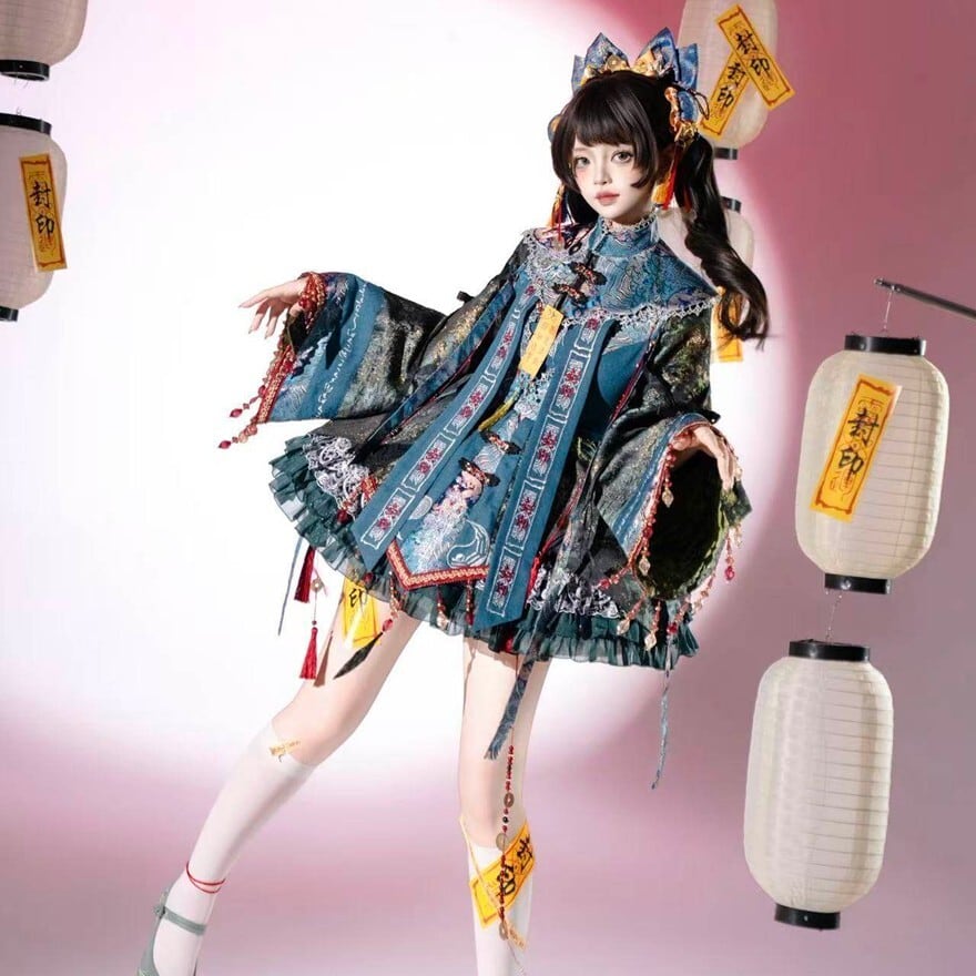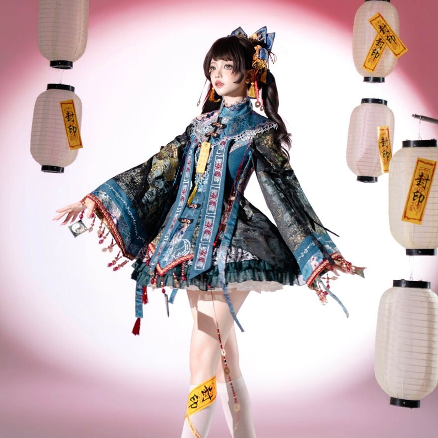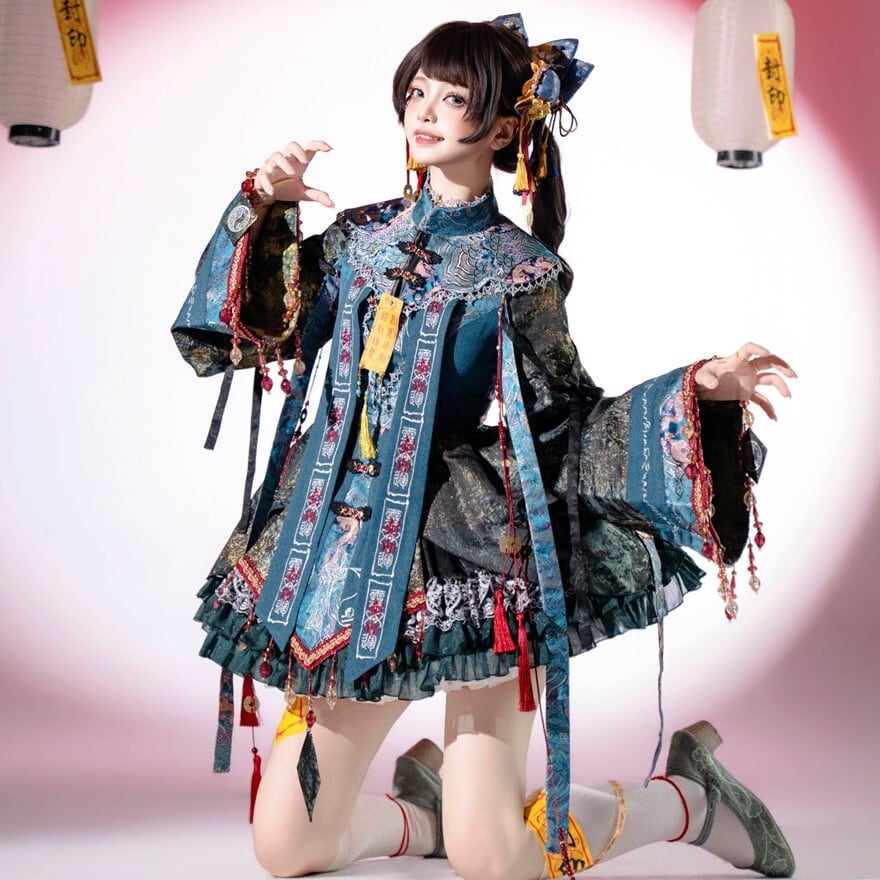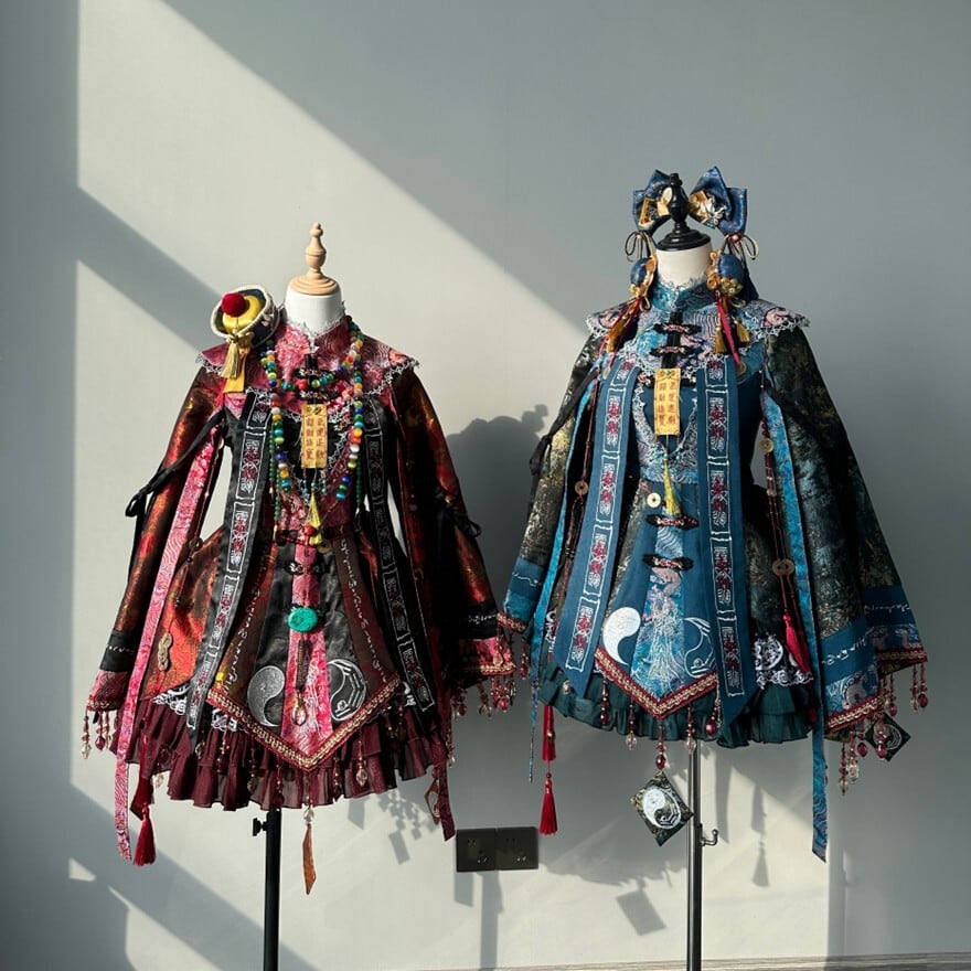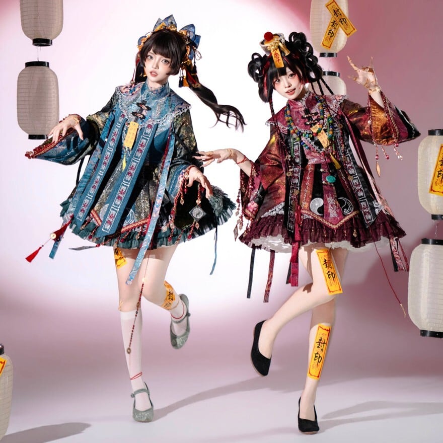 東洋的な意匠を取り入れたロリィタ向け長袖ワンピースです。多層構造のフリルスカートと広がりのある袖、御札風モチーフや装飾リボンが特徴で、青系と赤系の2色展開が確認できます。立体感のある装飾配置により、1着で世界観を完成させやすいデザインです。
