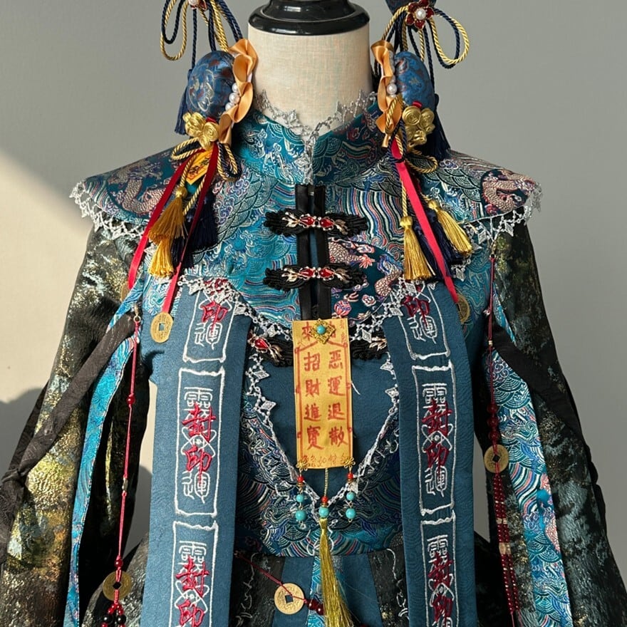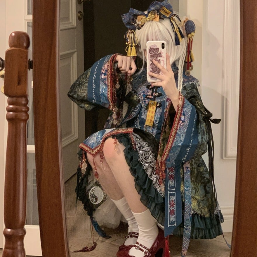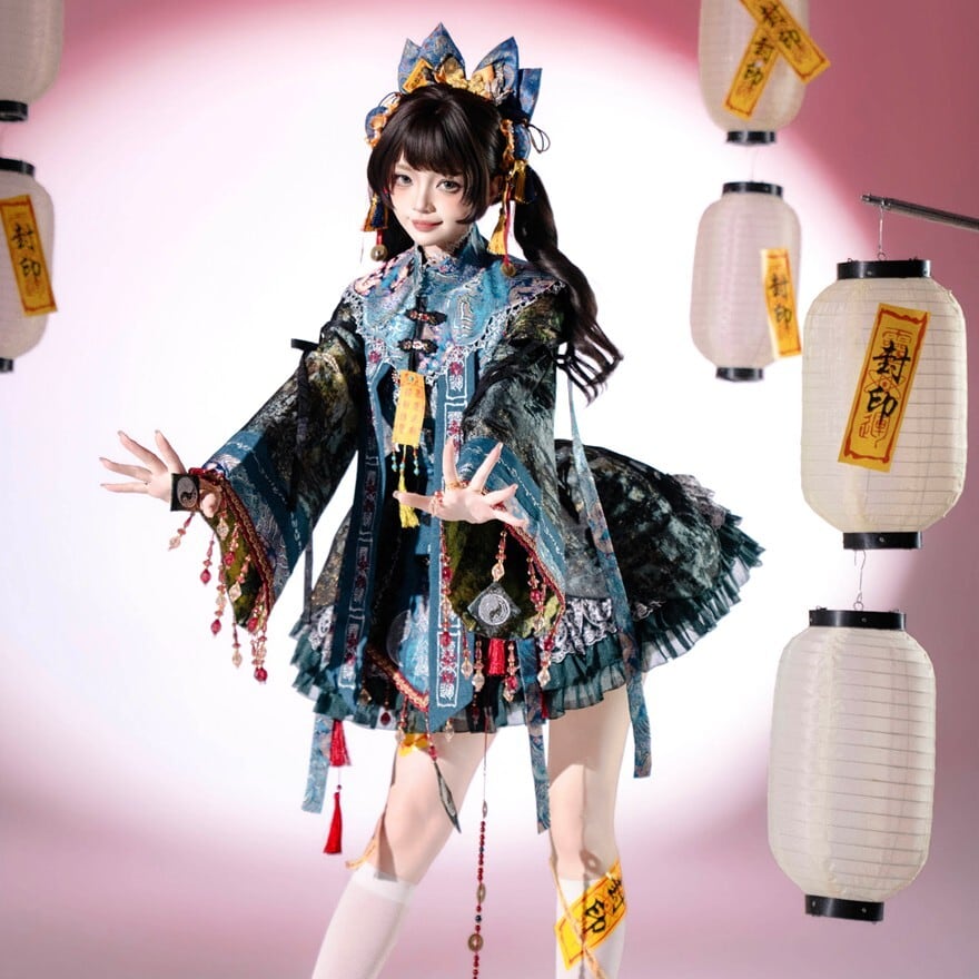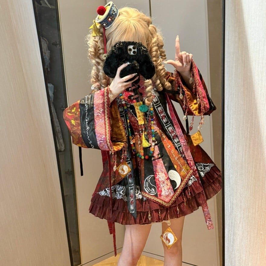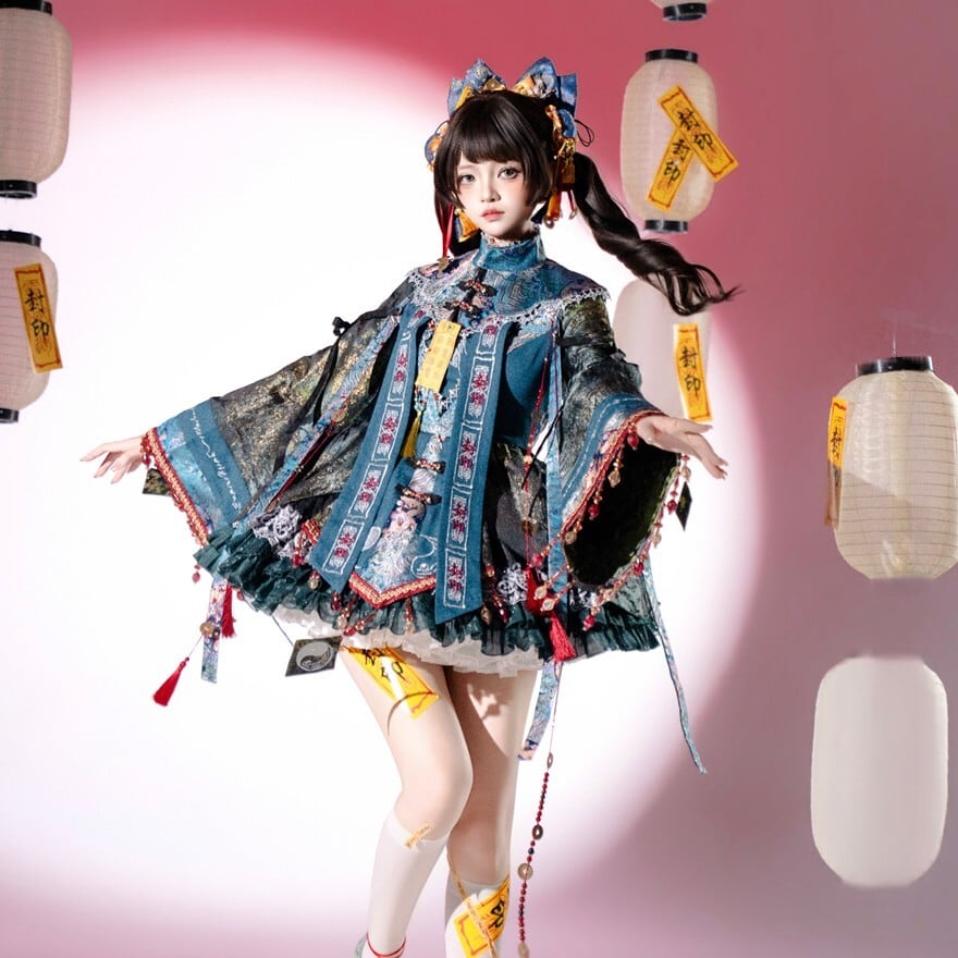 東洋的な意匠を取り入れたロリィタ向け長袖ワンピースです。多層構造のフリルスカートと広がりのある袖、御札風モチーフや装飾リボンが特徴で、青系と赤系の2色展開が確認できます。立体感のある装飾配置により、1着で世界観を完成させやすいデザインです。