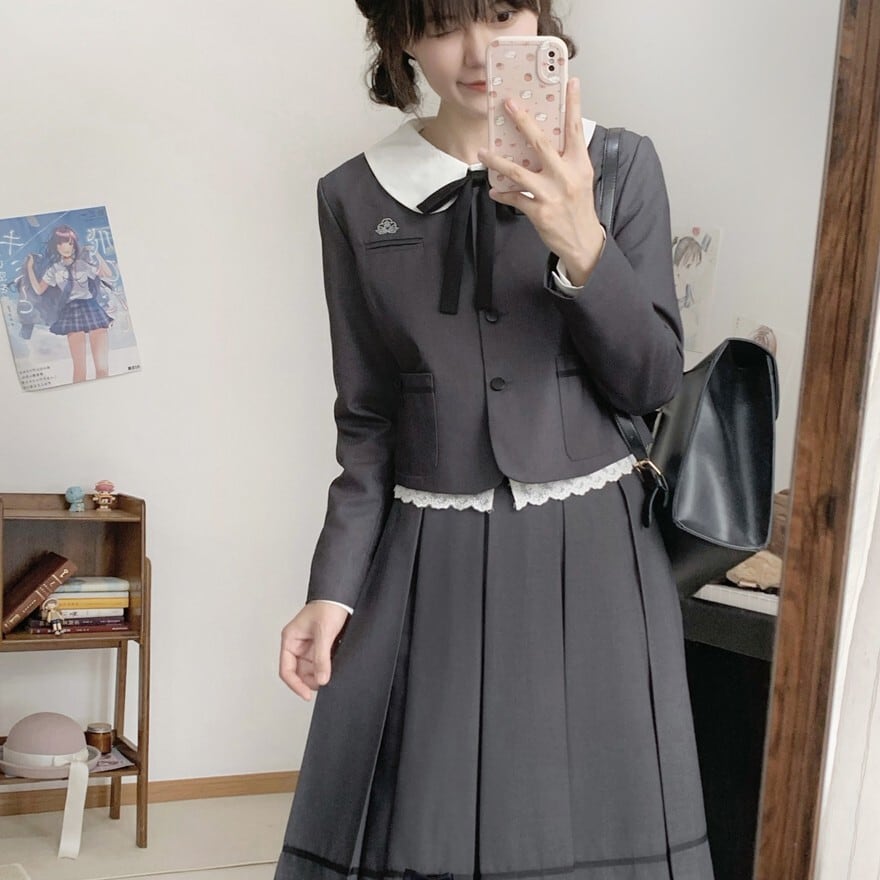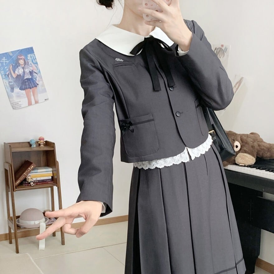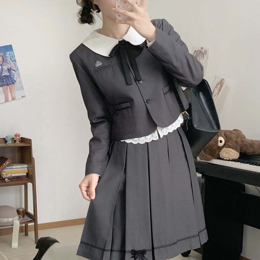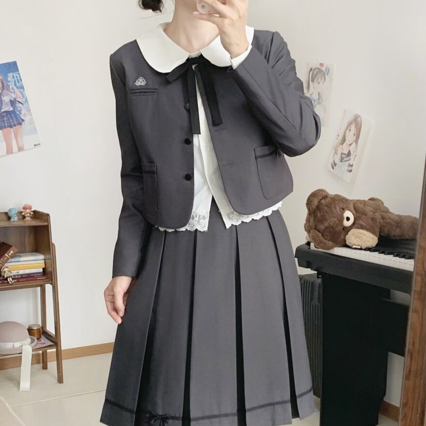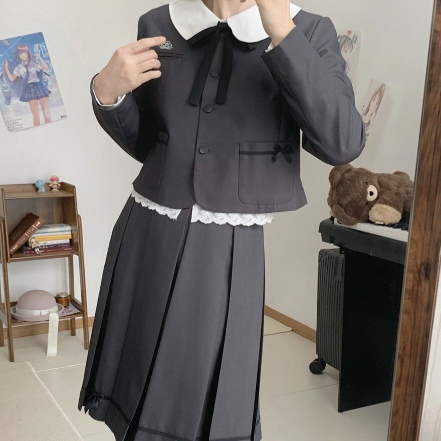 白襟ジャケット、リボン付きブラウス、プリーツスカートを組み合わせたクラシカル制服風ロリィタ3点セット。落ち着いた配色と直線的なシルエットが確認でき、甘さを抑えた印象です。式典にも対応しやすい上品なデザインが特徴です。