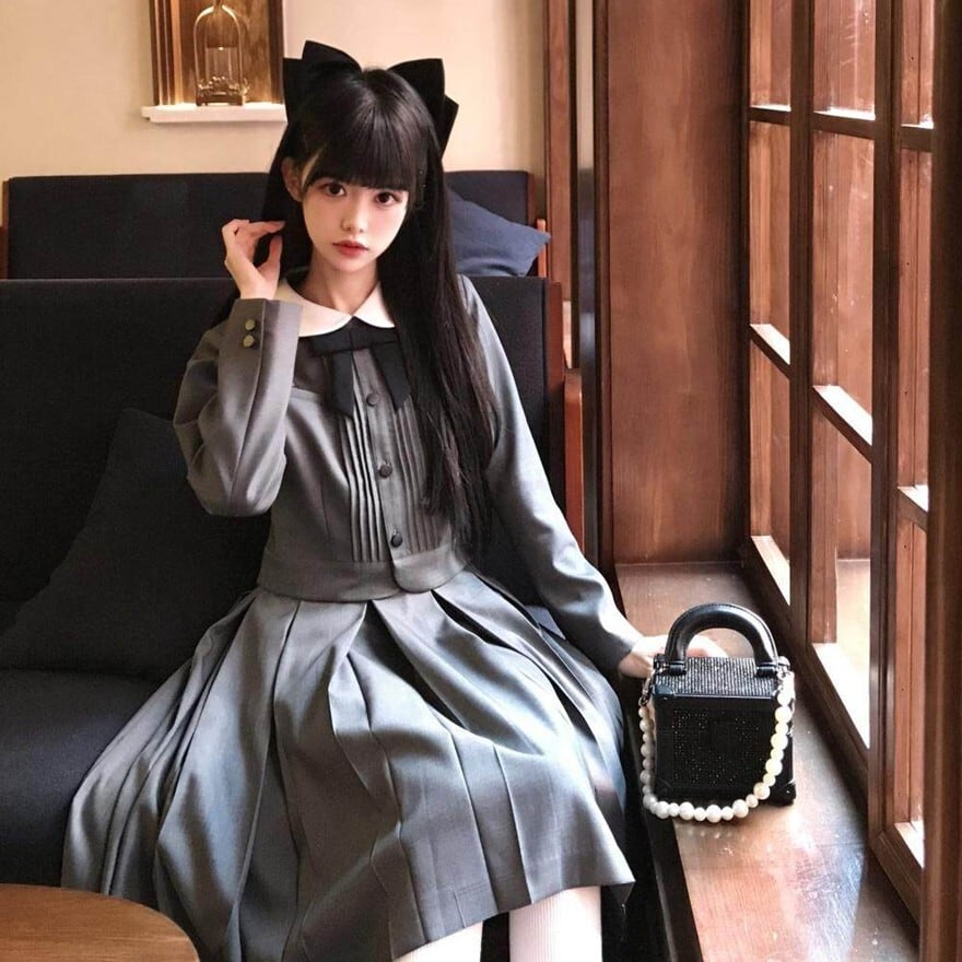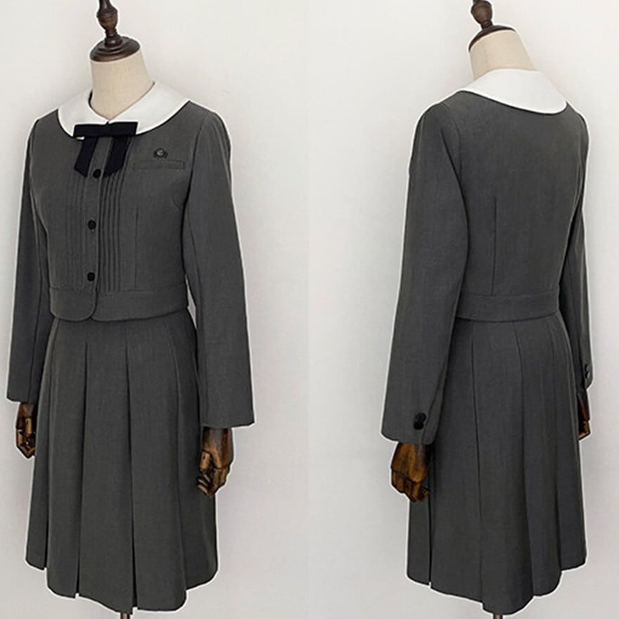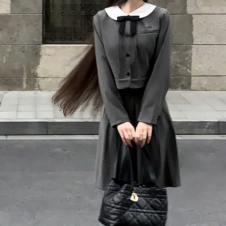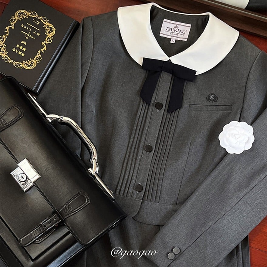 丸襟とリボンが印象的なクラシカルデザインのロリィタ上下セットです。長袖ジャケットと58cm丈プリーツスカートで構成され、落ち着いた色味と合身シルエットが特徴。甘さを抑えた端正な佇まいのため、卒業式や入学式など改まった場にも対応します。ロリィタ要素を残しつつ実用性も意識した一着です。