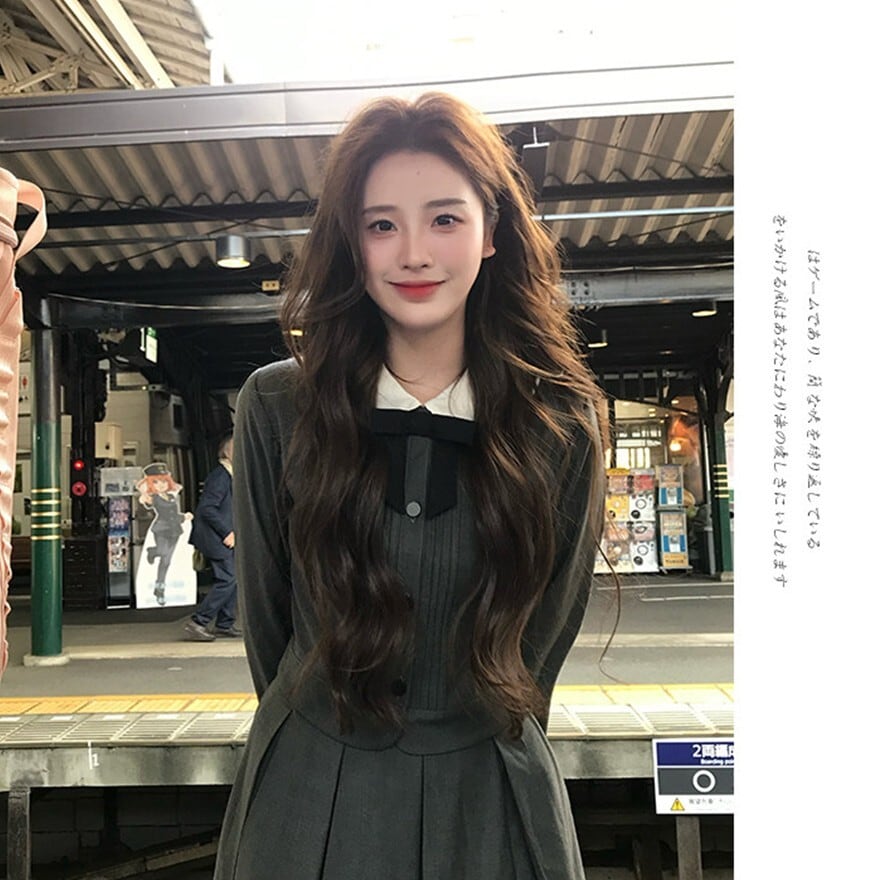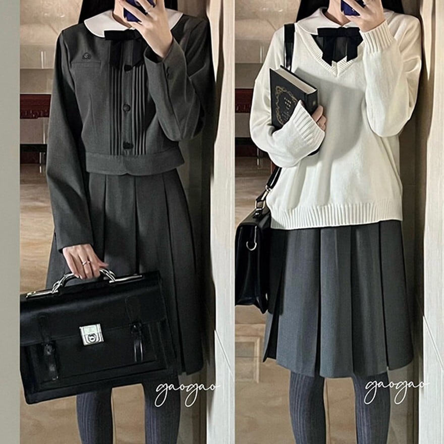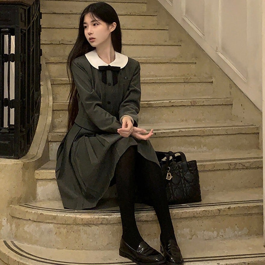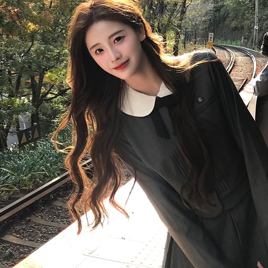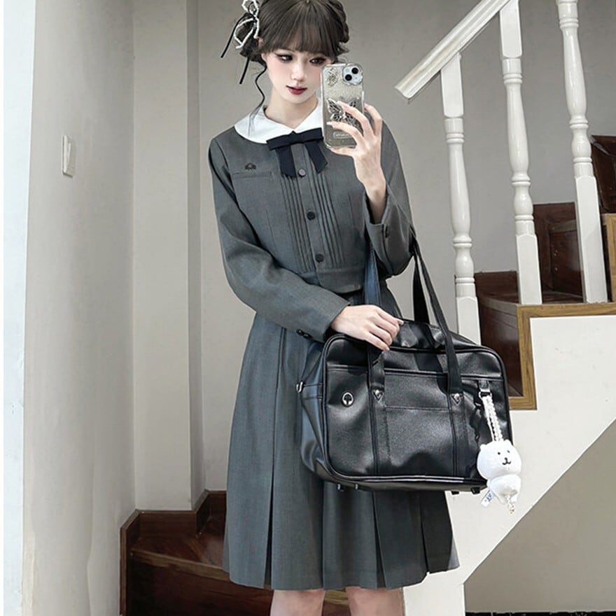 丸襟とリボンが印象的なクラシカルデザインのロリィタ上下セットです。長袖ジャケットと58cm丈プリーツスカートで構成され、落ち着いた色味と合身シルエットが特徴。甘さを抑えた端正な佇まいのため、卒業式や入学式など改まった場にも対応します。ロリィタ要素を残しつつ実用性も意識した一着です。