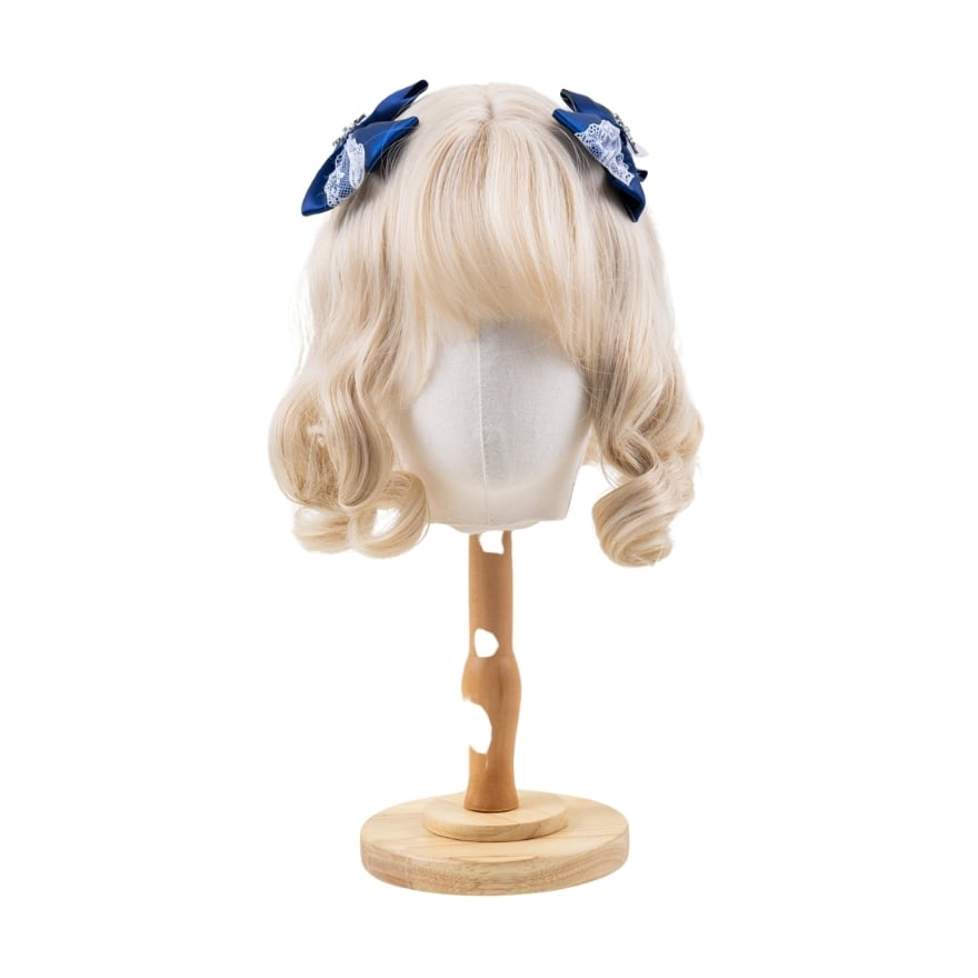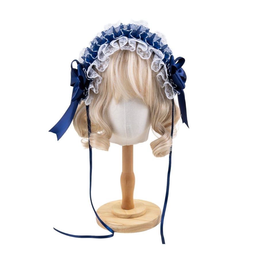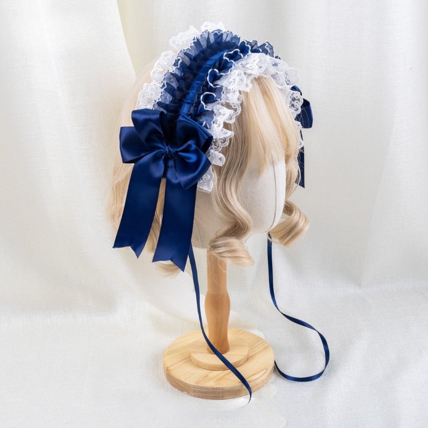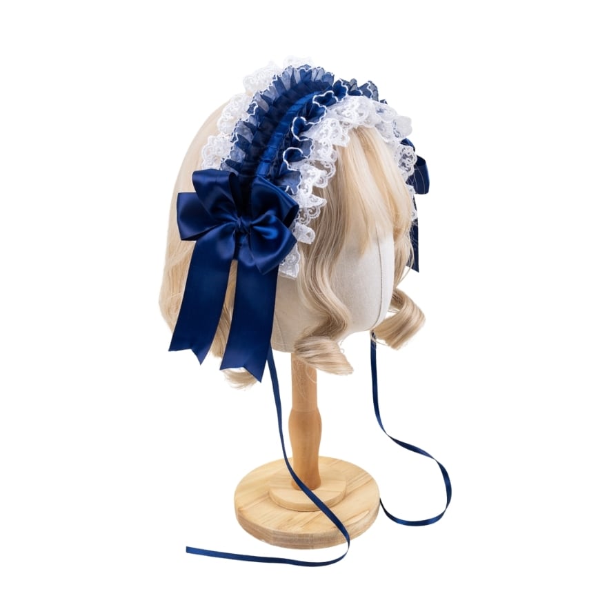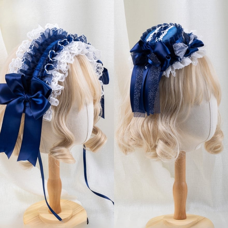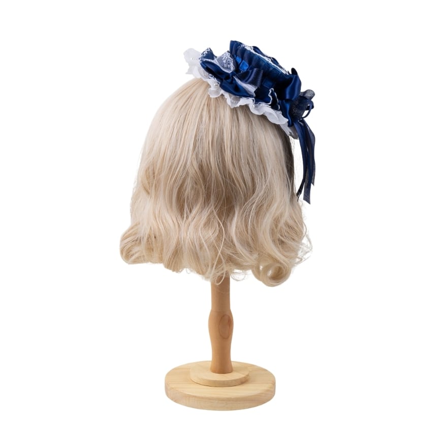 深みのあるネイビーリボンと繊細なレースが重なり合うロリィタ小帽子。程よいボリュームで横顔まで華やかに演出し、クラシカルやお嬢様風コーデに上品なアクセントを添えます。いつもの装いを格上げしたい方におすすめです。