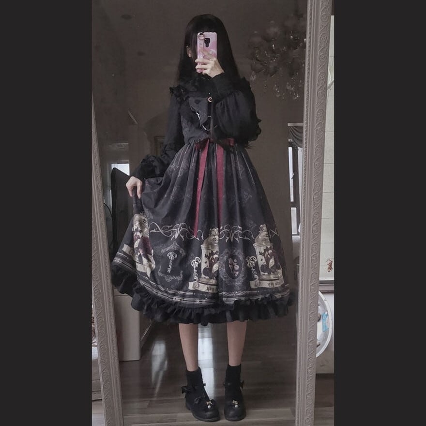 アンティークな書庫を彷彿とさせる繊細なプリントと、ウエストの深紅のリボンが目を引くジャンパースカートです。胸元のチェーン装飾と贅沢な多層フリルが、重厚でミステリアスな貴婦人を演出。背中のシャーリングでシルエットも美しく、ブラウス合わせで王道ゴシックな装いが完成する、至高の一着です。