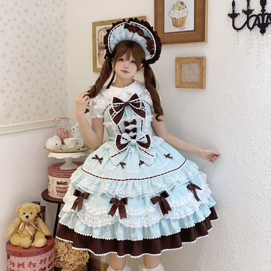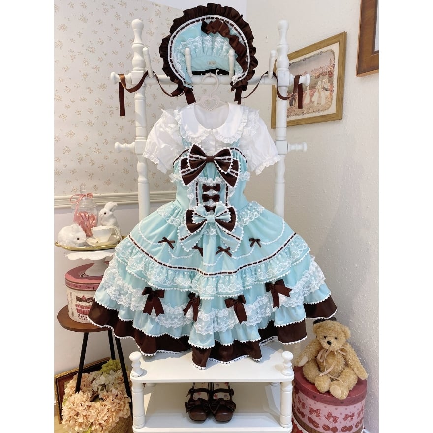 パステルカラーとチョコレートのような配色が、まるでお茶会の主役のような可愛らしさを引き立てる一着です。