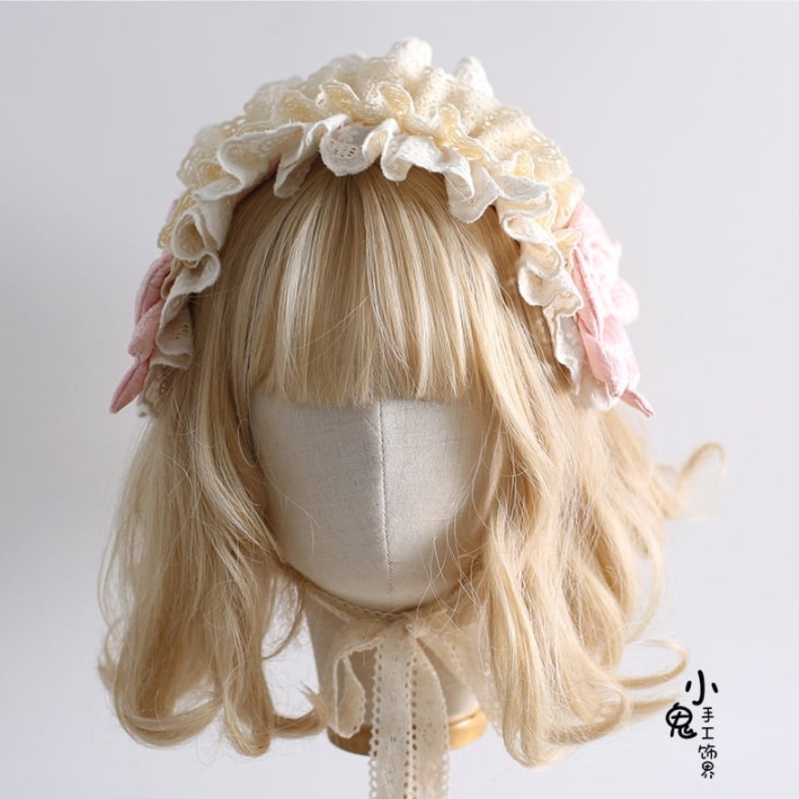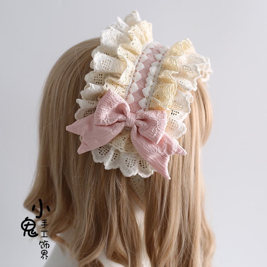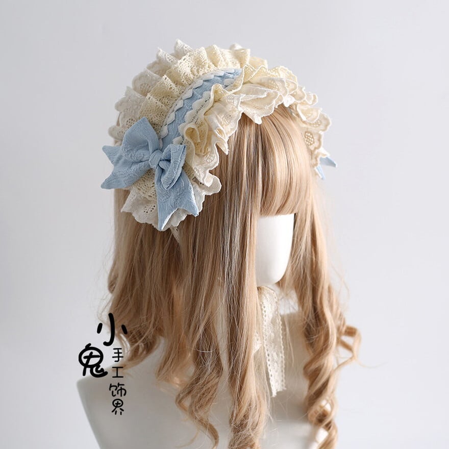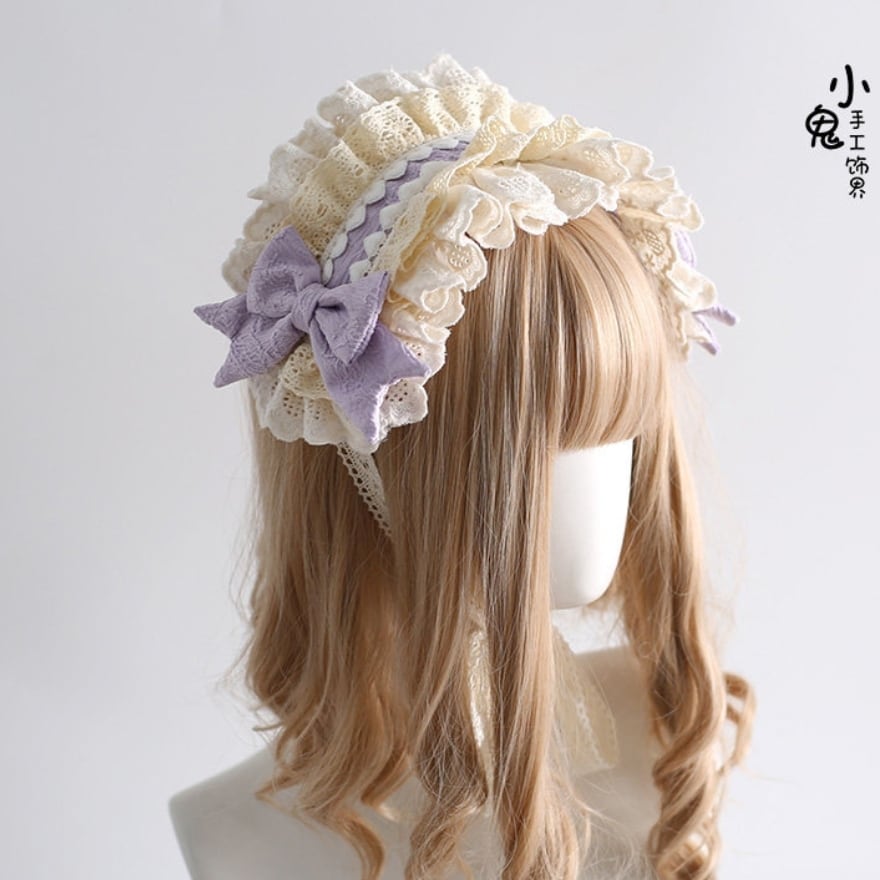 繊細な刺繍を施したコットン風レースを幾重にも重ねた、ボリューム感のあるヘッドドレスです。両サイドには存在感のあるリボンをあしらい、中央にはアクセントカラーの帯を通したデザイン。クラシカルな甘ロリスタイルを完成させる、可憐さと気品を兼ね備えたヘアアクセサリーです。