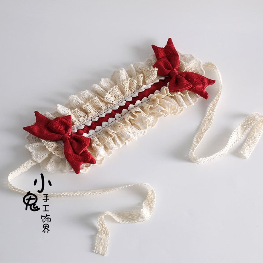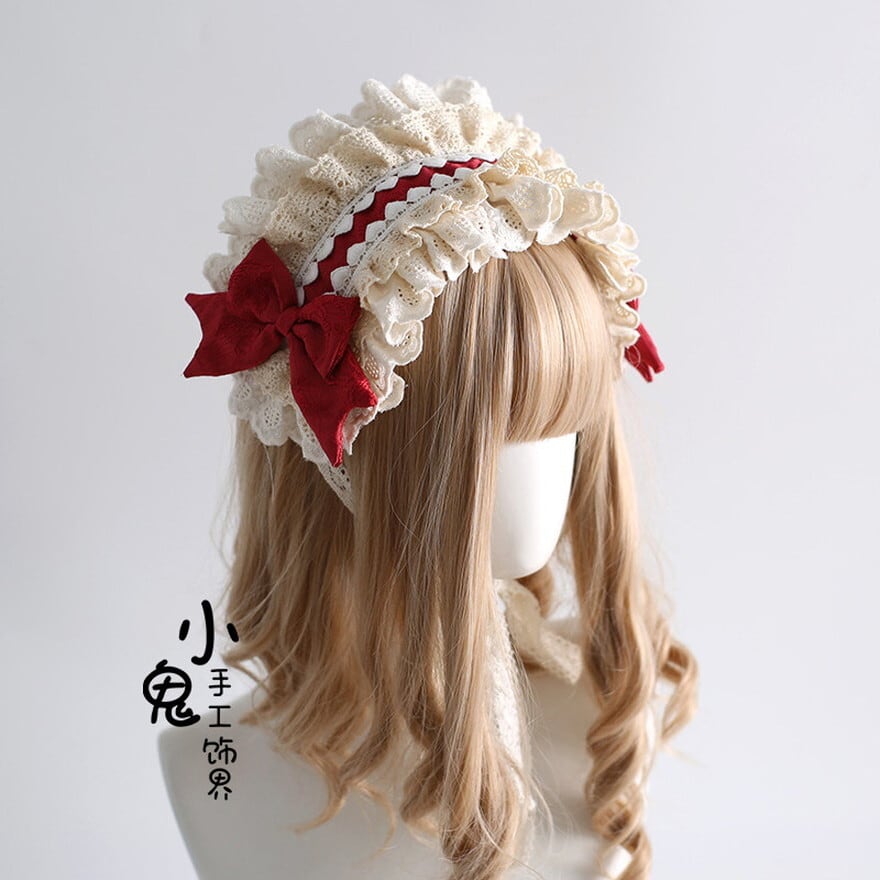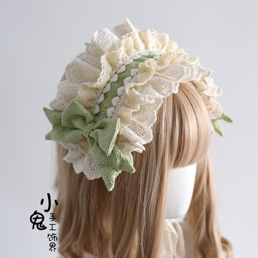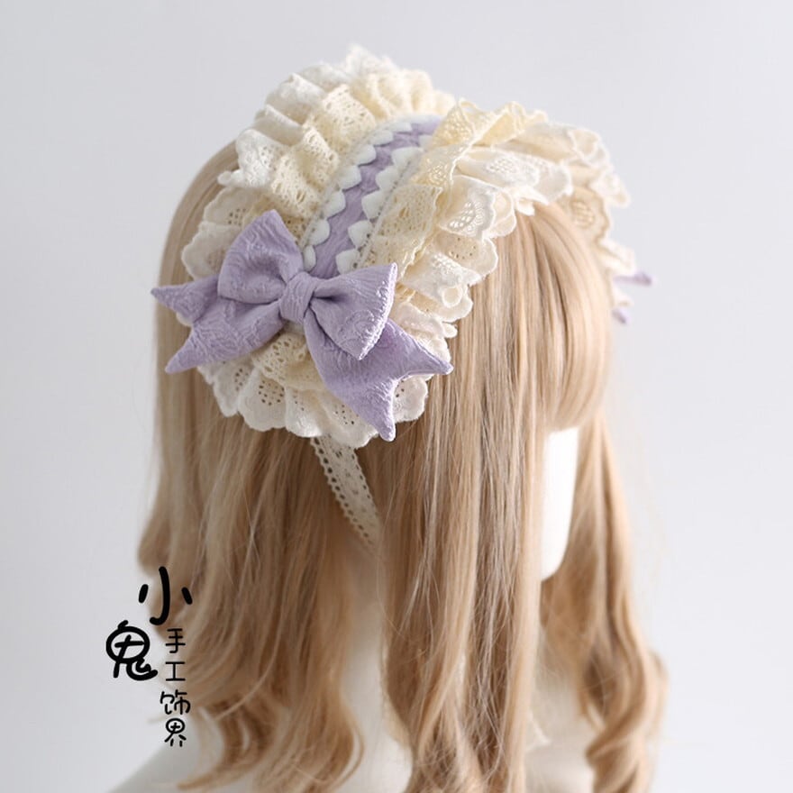 繊細な刺繍を施したコットン風レースを幾重にも重ねた、ボリューム感のあるヘッドドレスです。両サイドには存在感のあるリボンをあしらい、中央にはアクセントカラーの帯を通したデザイン。クラシカルな甘ロリスタイルを完成させる、可憐さと気品を兼ね備えたヘアアクセサリーです。