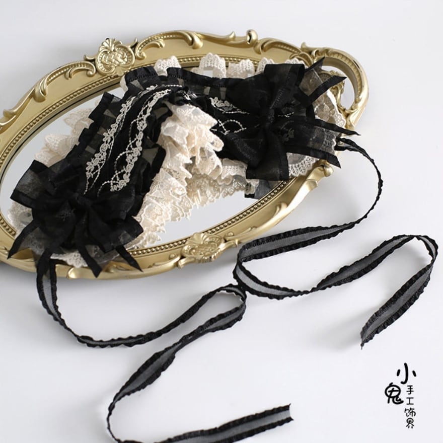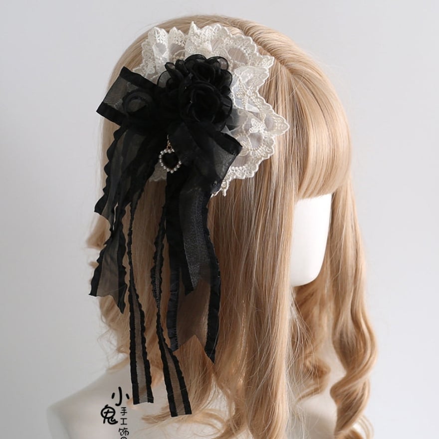 漆黒の薔薇を中心に、透け感のあるシアーリボンを贅沢にあしらった、耽美な世界観を放つヘアアクセサリーです。背面の白いレースが影を引き立て、中央にはパールの装飾が施されたハート型のチャームが輝きます。ゴシックロリータの装いに深みを与える、ダークで優雅なデザインが特徴です。