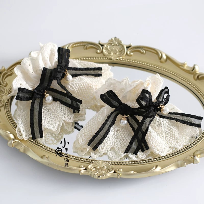 軽やかなシアー素材のリボンを使用することで、漆黒の重厚感と繊細な透明感を両立させています。中央のパール装飾チャームが視線を集めるアクセントとなり、顔周りや胸元を華やかに彩ります。