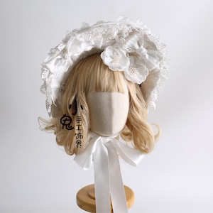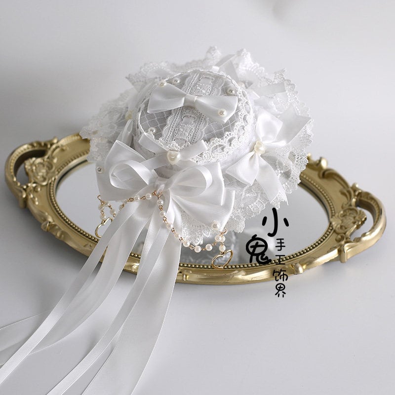 白のフリルレースをベースに、落ち着いたピンクのリボンを贅沢にあしらった甘ロリスタイルのヘッドドレスです。中央にはリボンの編み上げデザインを施し、両サイドには存在感のある大きなリボンと、小さな薔薇のモチーフが添えられています。繊細なレース使いが、顔周りに耽美な華やぎを与えます。