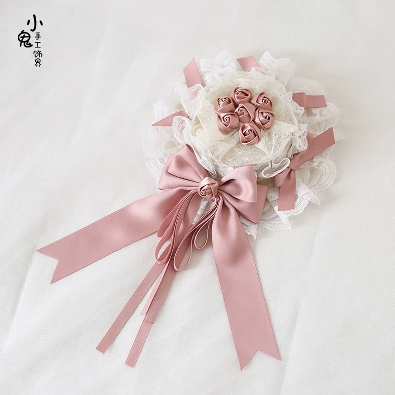 やわらかなピンクカラーのサテンリボンに、ローズモチーフをあしらったクラシカルロリィタ向けカチューシャです。
