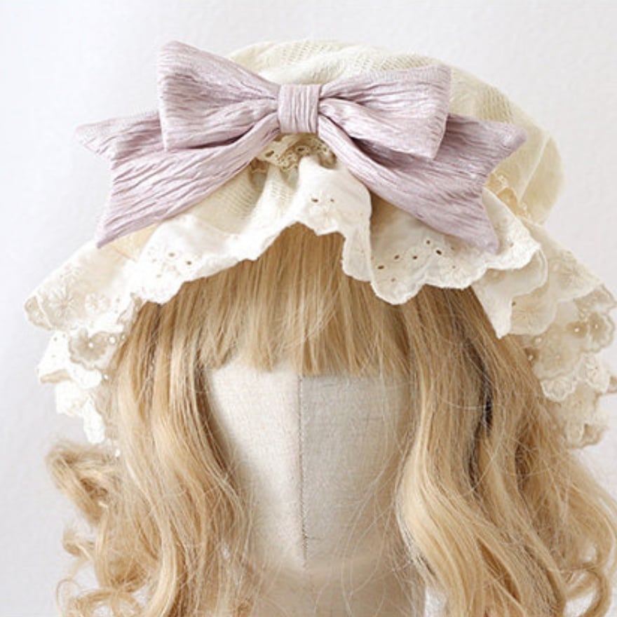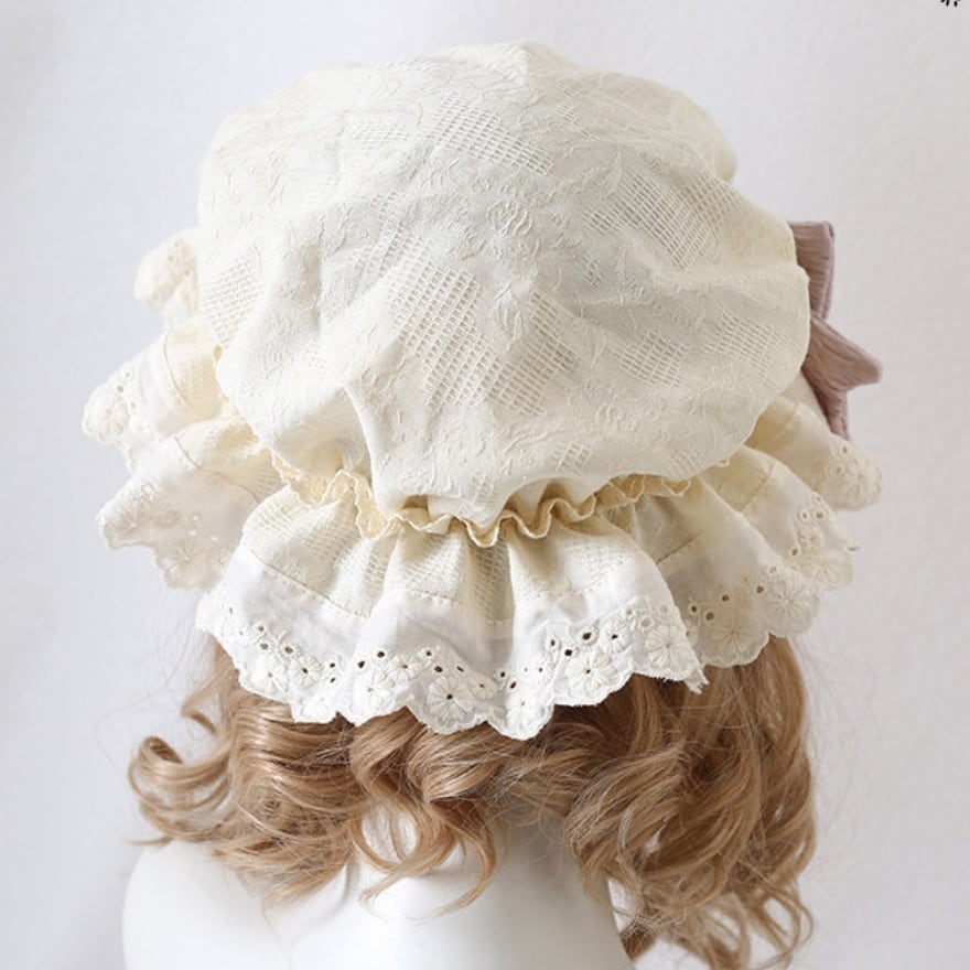 幅広のフリルレースが顔周りを囲む構造になっており、視覚的な小顔効果が期待できます。また、後頭部まで包み込むボネット形式のため、ヘアアレンジの崩れをカバーしつつ、どこから見ても隙のない耽美なバックスタイルを実現します。