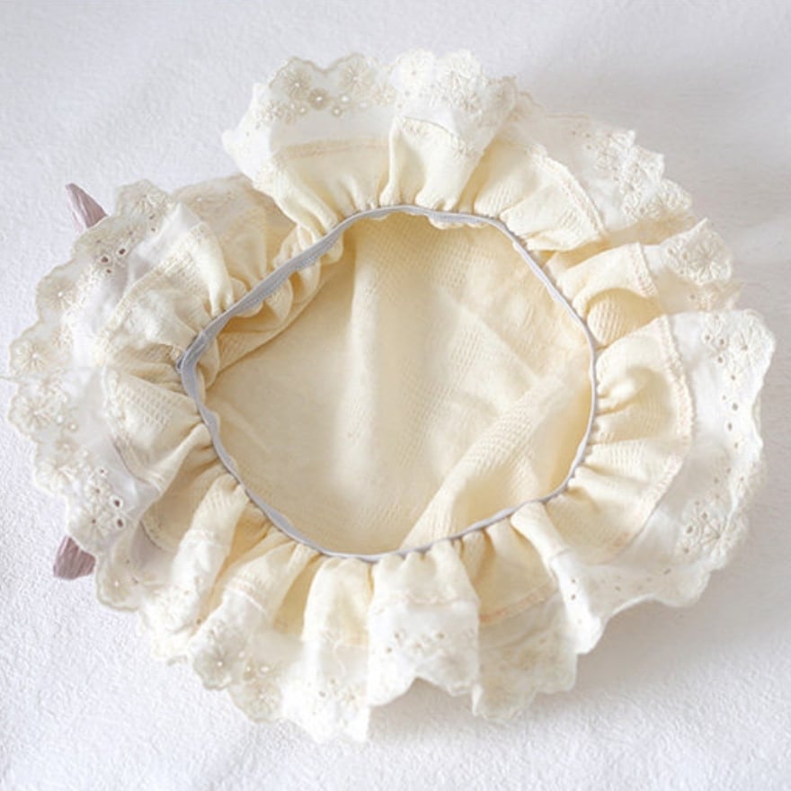 甘ロリや耽美な装いに欠かせない、ボリューム感のあるフリルレースが特徴的なボネットです。清潔感のあるオフホワイトの生地に、立体的な織り模様のリボンをサイドにあしらいました。顔周りを優しく包み込むデザインが、可憐で幻想的なシルエットを演出します。細やかなカットワークレースが繊細な美しさを引き立てます。