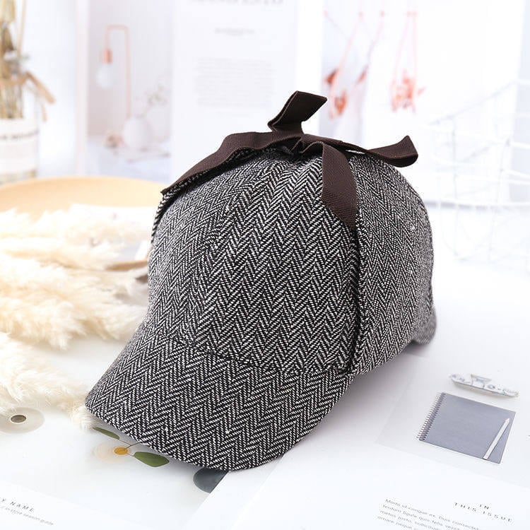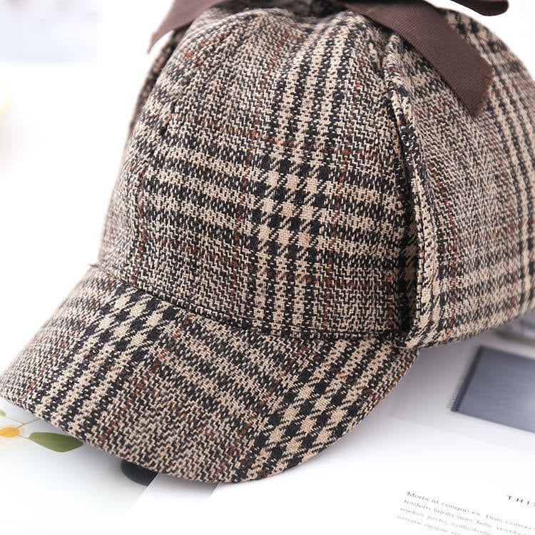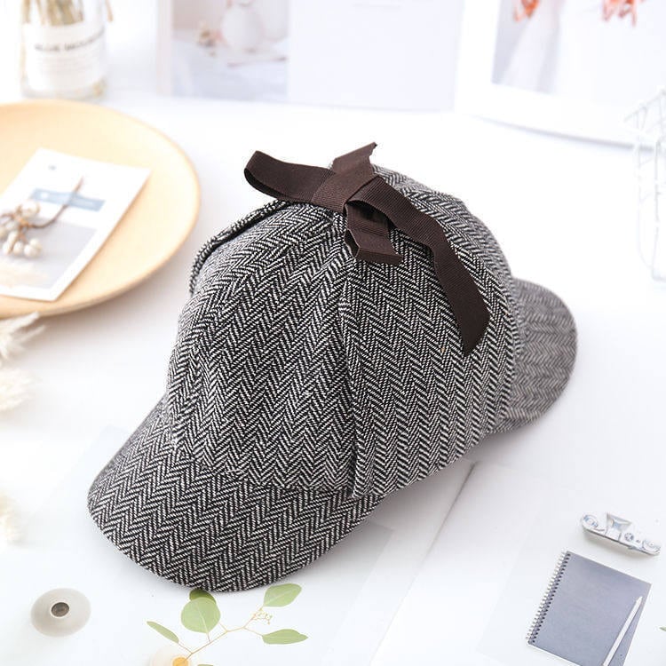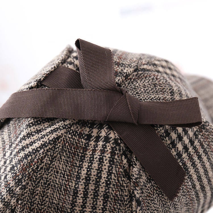 伝統的なヘリンボーンとグレンチェックが目を引く、知的な英国探偵風の帽子です。トップにあしらわれた控えめなブラウンリボンが、マニッシュな中に可愛らしさをプラス。皇子系スタイルやクラシカルロリィタのアクセントに最適です。耳当て付きのシルエットが、冬の街歩きをドラマチックに演出します。