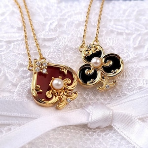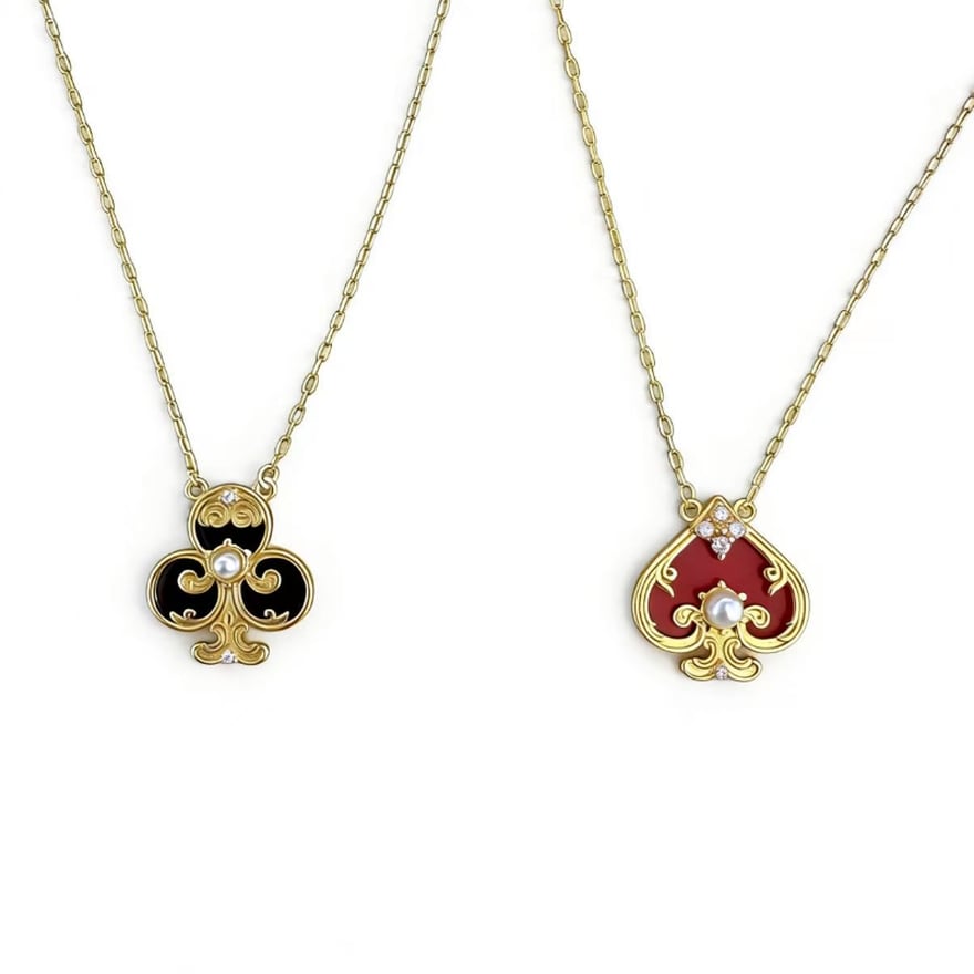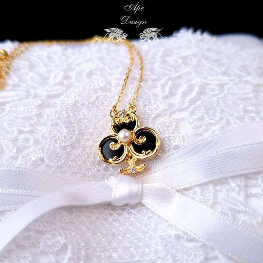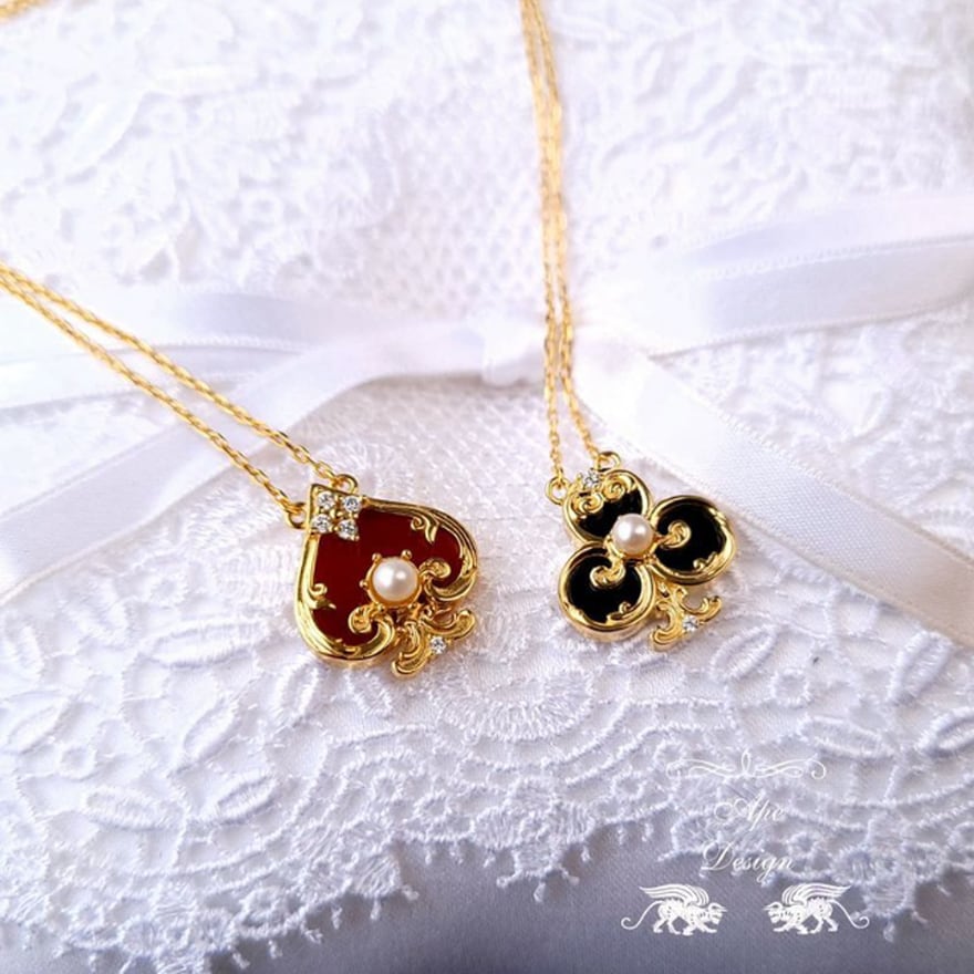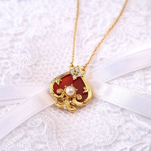 運命を司るトランプの記号に、気品溢れるパールを添えた至高のペンダント。深紅のスペードと漆黒のクローバーが、貴方の胸元にアンティークな物語を刻みます。クラシカルなゴールドの輝きは、アリス風コーデやクラロリの仕上げに。日常を特別なティーパーティーへと誘う、愛らしくも高貴な魔法をその身に纏って。