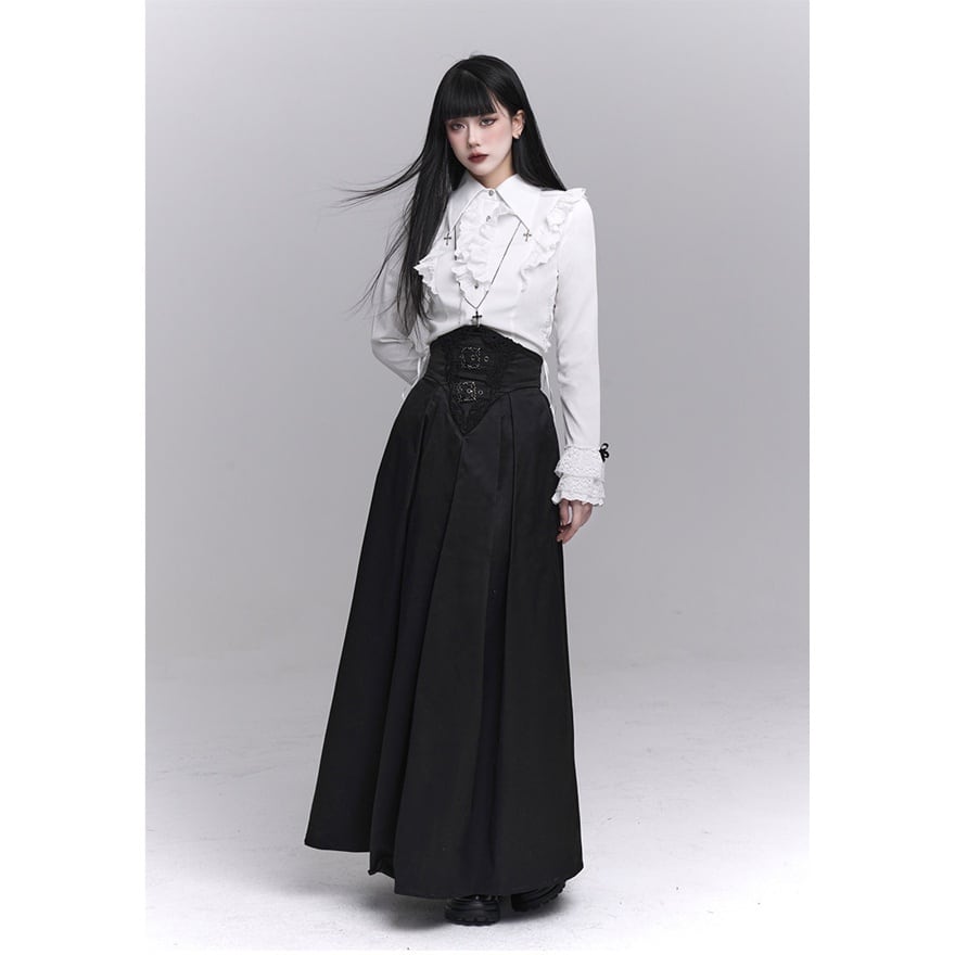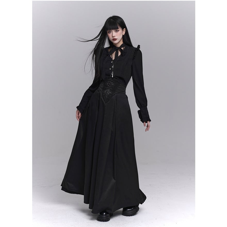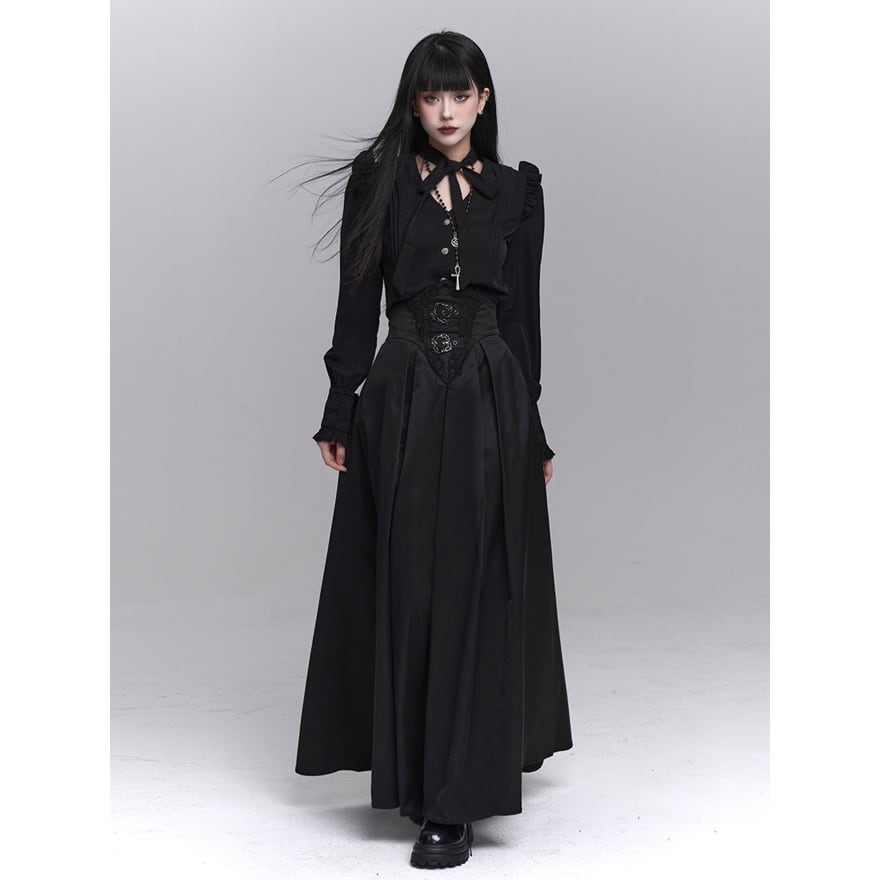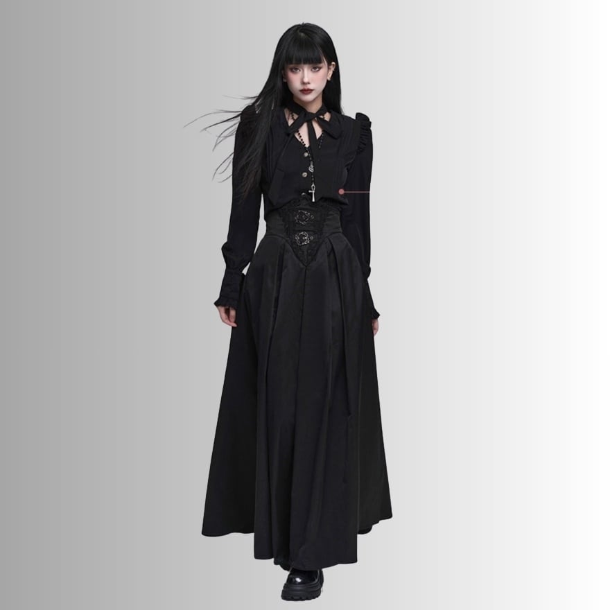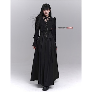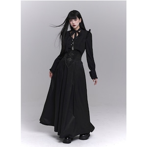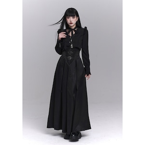 漆黒の闇に溶け込むような、洗練された修道女(シスター)スタイルのロングスカートです。目を引くハイウエストのコルセットデザインが、ドラマティックで美しいシルエットを演出。重厚感のあるプリーツと繊細な装飾が、ゴシックかつモードな気品を漂わせます。別売りのブラウスと合わせれば、高潔でミステリアスな地雷系・ゴスロリコーデの完成です。