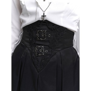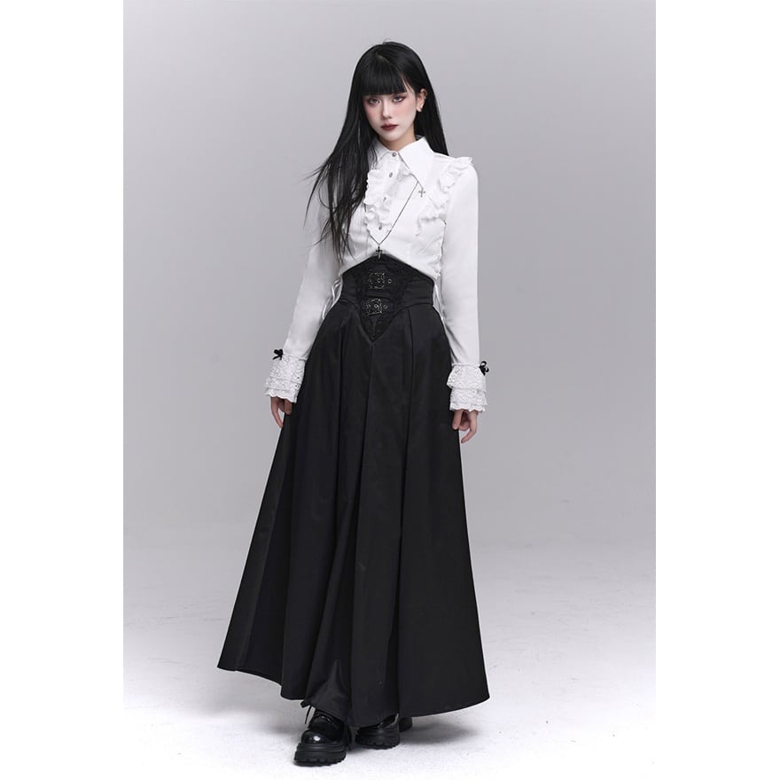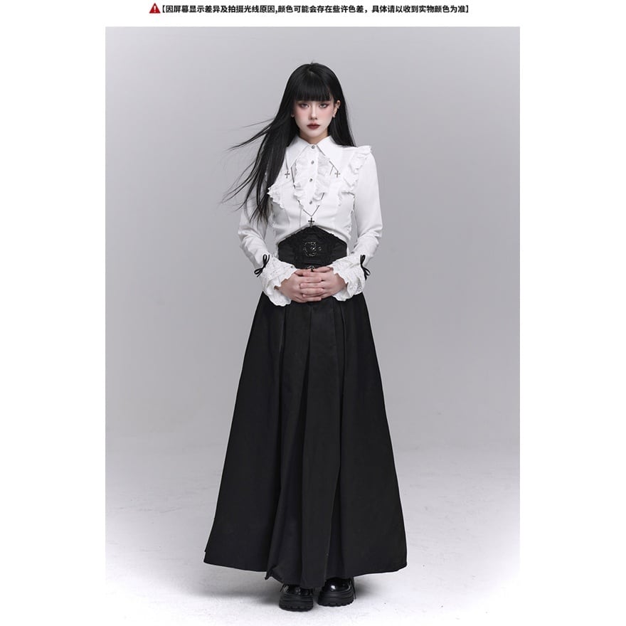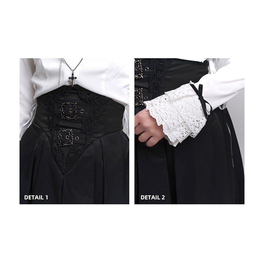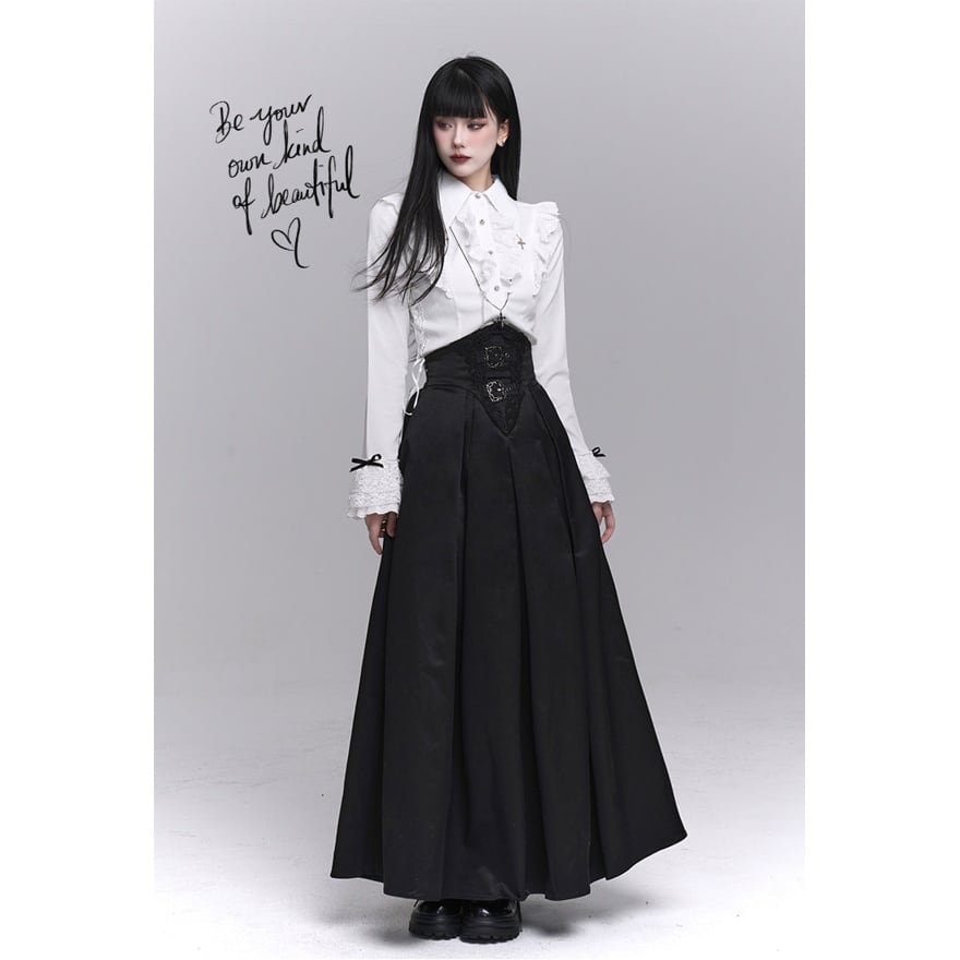 漆黒の闇に溶け込むような、洗練された修道女(シスター)スタイルのロングスカートです。目を引くハイウエストのコルセットデザインが、ドラマティックで美しいシルエットを演出。重厚感のあるプリーツと繊細な装飾が、ゴシックかつモードな気品を漂わせます。別売りのブラウスと合わせれば、高潔でミステリアスな地雷系・ゴスロリコーデの完成です。
