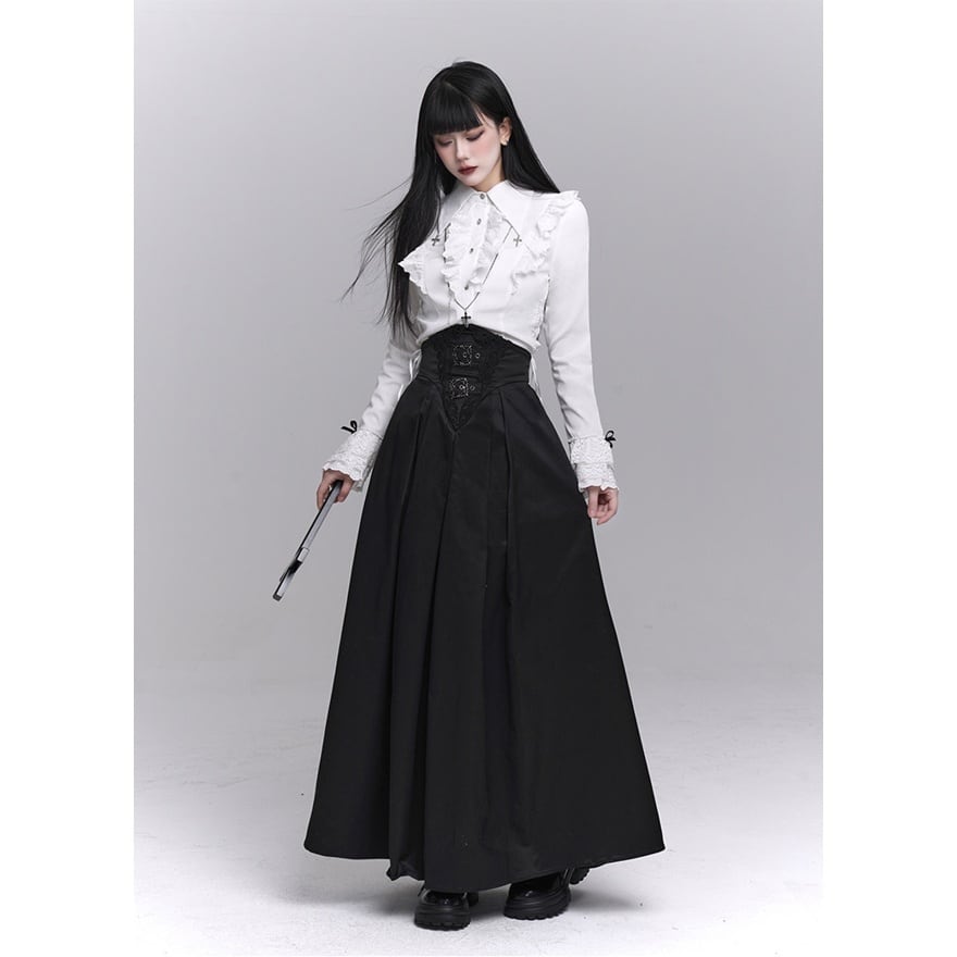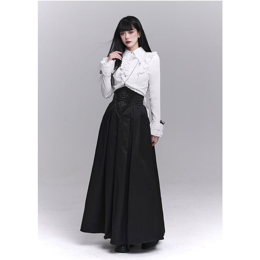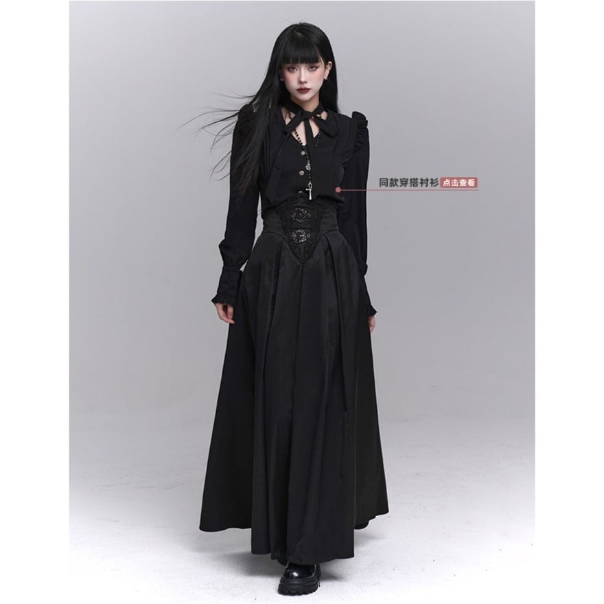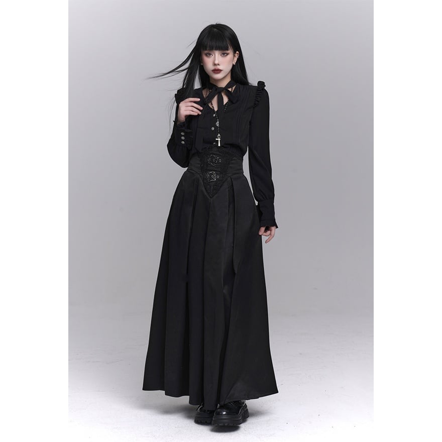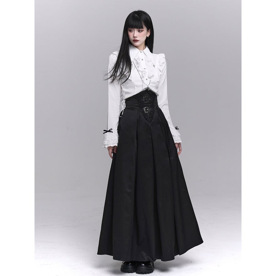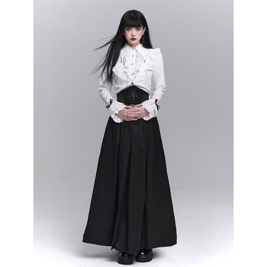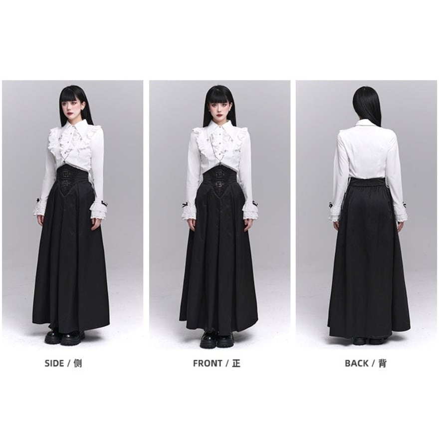 フリル装飾と縦ラインを強調したシルエットが印象的な、ゴシックテイストの長袖ブラウスです。