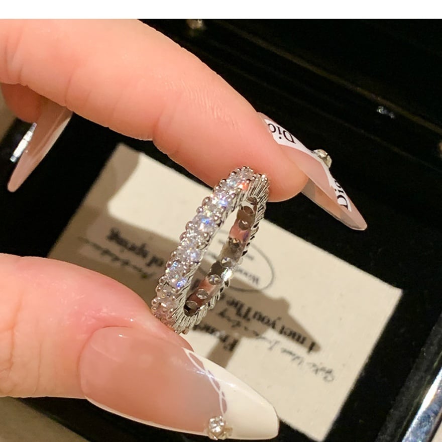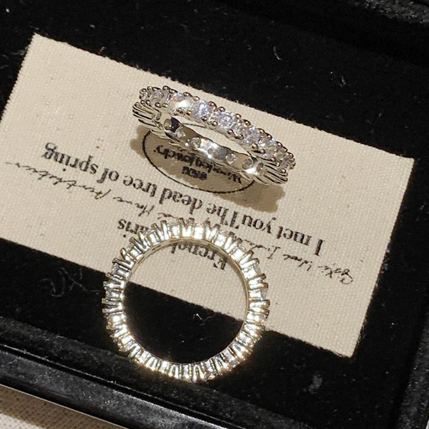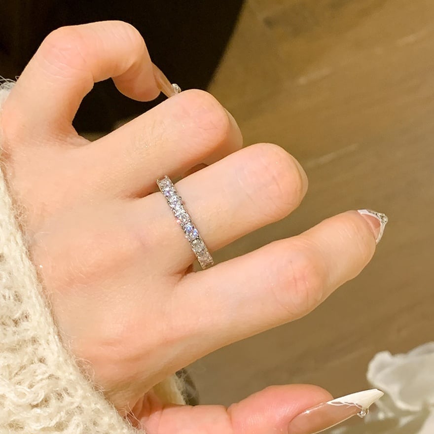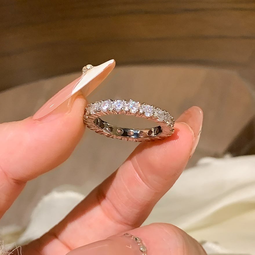 指元を一周取り囲むようにストーンを配した、シンプルで洗練されたエタニティ風リングです。