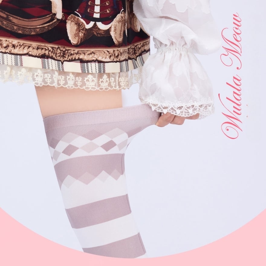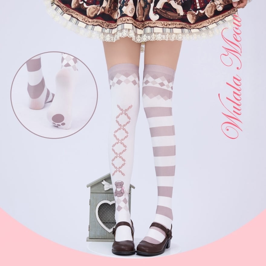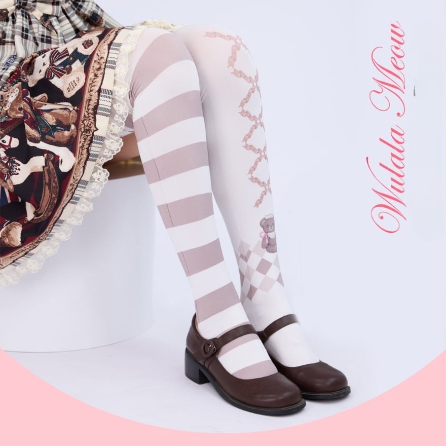 左右で異なる柄が楽しめる、甘ロリ・地雷系コーデにぴったりのデザインタイツ。片脚には編み上げ風のモチーフと小さなくまのワンポイント、もう片脚にはやわらかな配色のボーダー柄をあしらい、足元を可愛く印象的に演出します。淡いカラーでコーデに取り入れやすく、スカートスタイルをより甘く引き立ててくれる一足です。足裏にはさりげない肉球デザインも。
