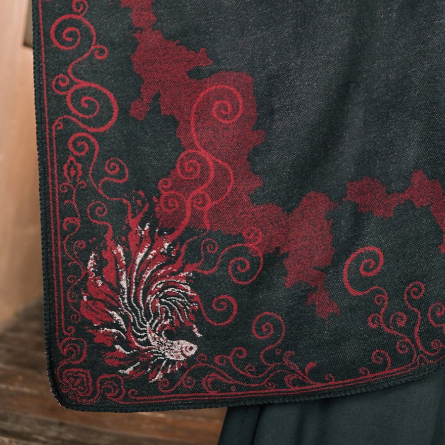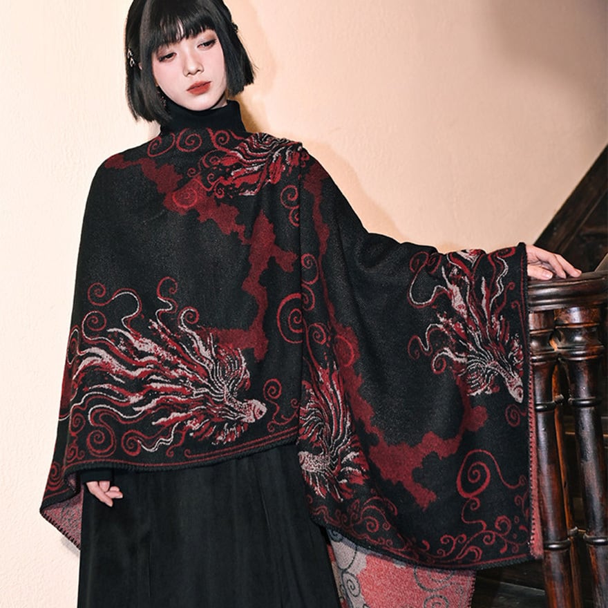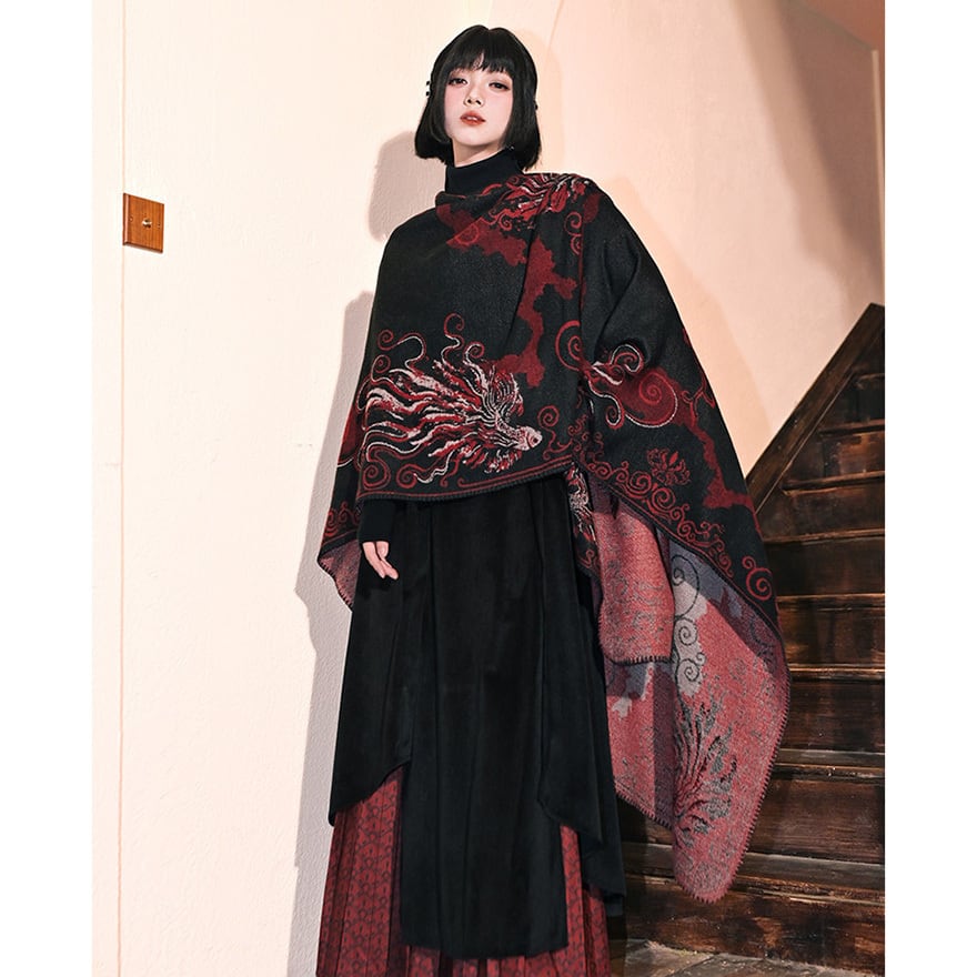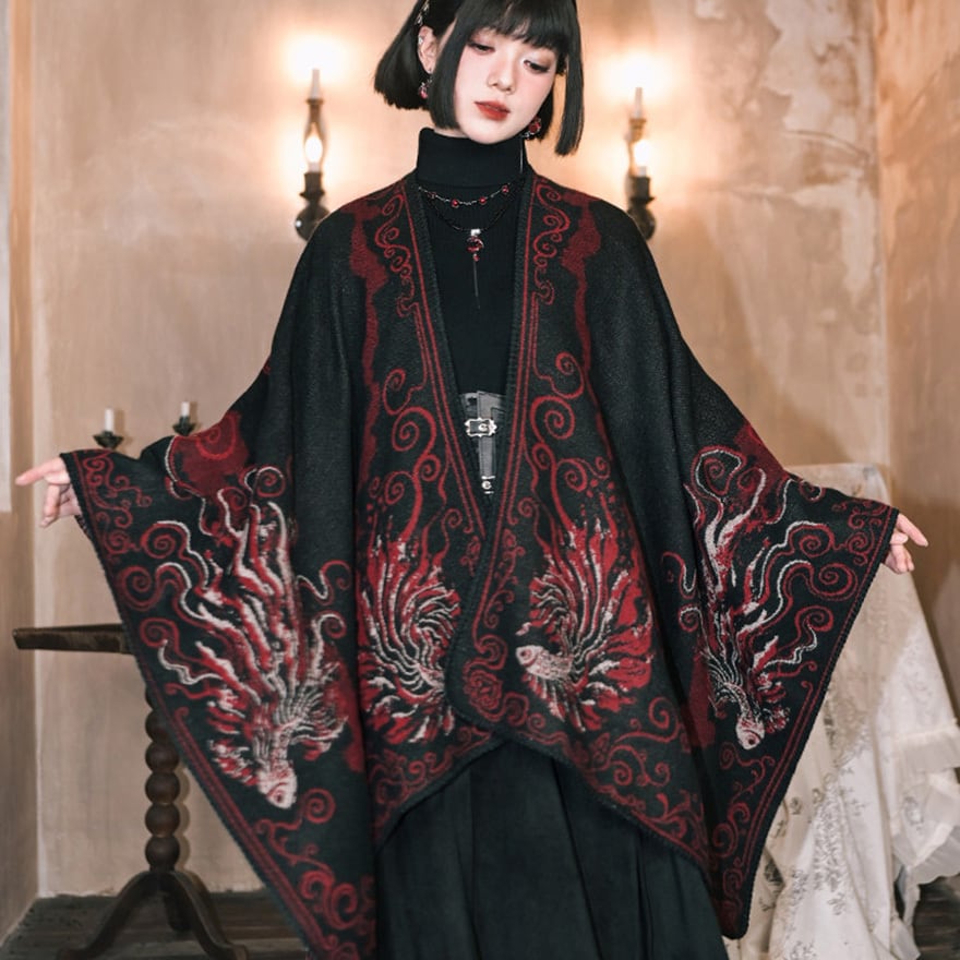 中華・チャイナゴシックの世界観を纏う、黒地に金魚と雲紋を配したジャカードケープマントです。バットウィング状に広がる大きなシルエットと、深みのあるボルドーレッドの装飾が、妖艶で神秘的な存在感を生み出します。撮影会やイベント衣装として映える一枚。