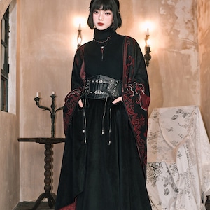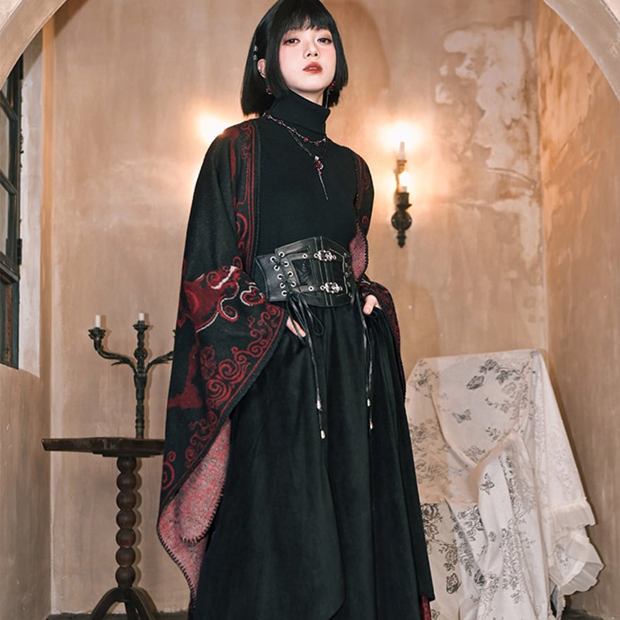 このマントは前開きのケープ仕様で、インナーを選びません。黒のタートルネックやハイネックのトップスにボリュームのあるスカートやロングスカートを合わせるだけで、ショップのコーディネートのような完成度に近づきます。ベルトでウエストをマークすれば、広がりのあるシルエットに縦のラインが加わり、スタイリッシュな中華ゴシックコーデが成立します。日常使いというよりも撮影会・イベント・コスプレ用途に力を発揮するアイテムで、「何を着ていくか迷ったとき」の答えになる一枚です。