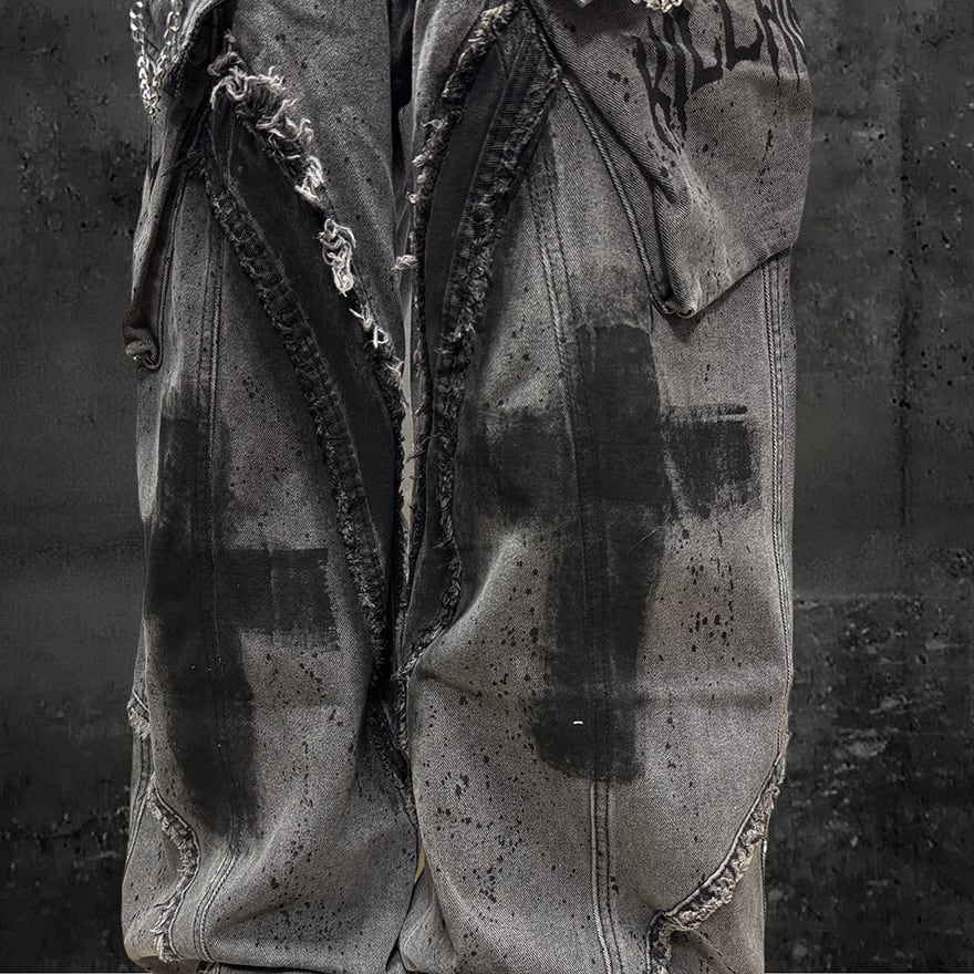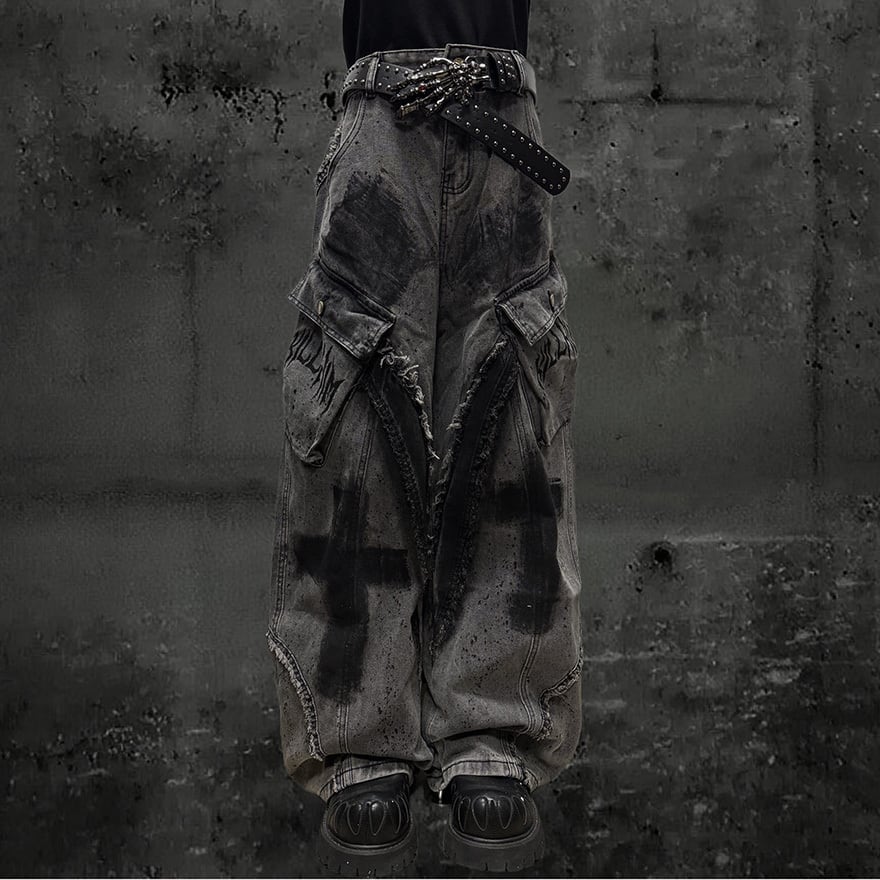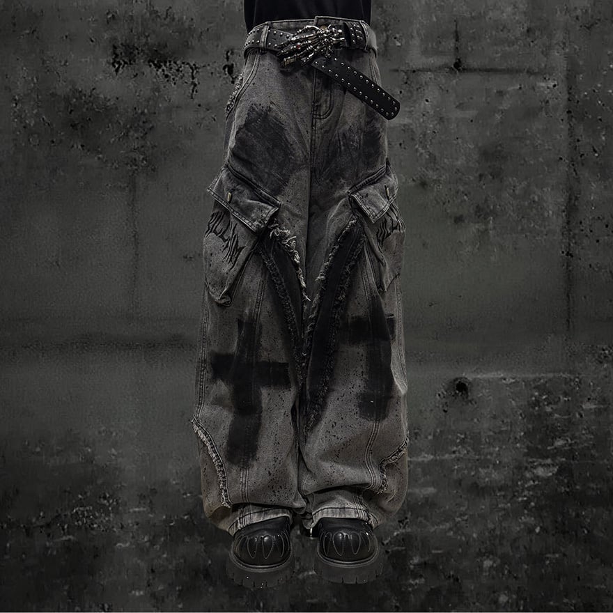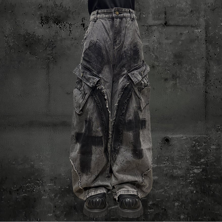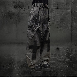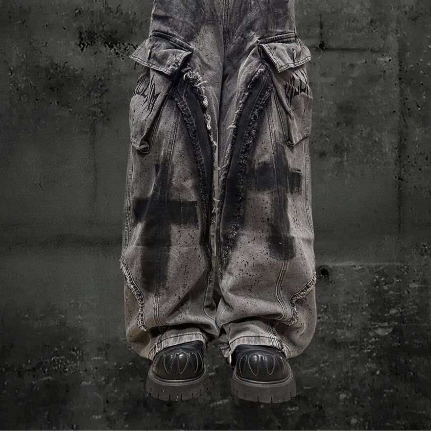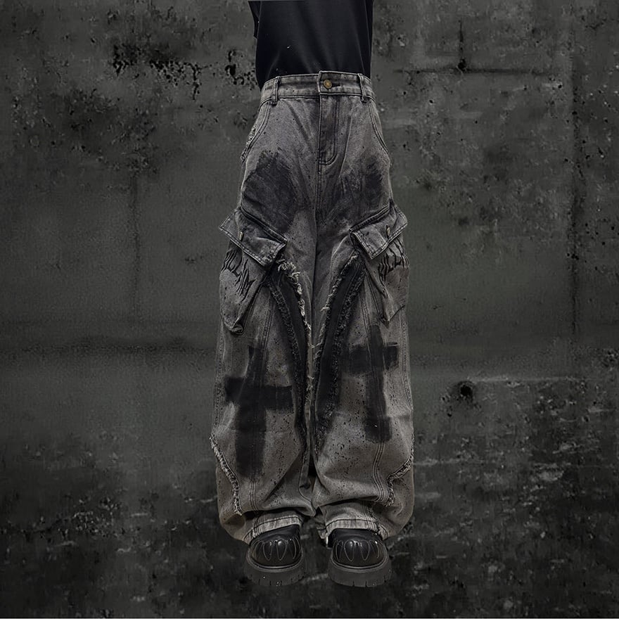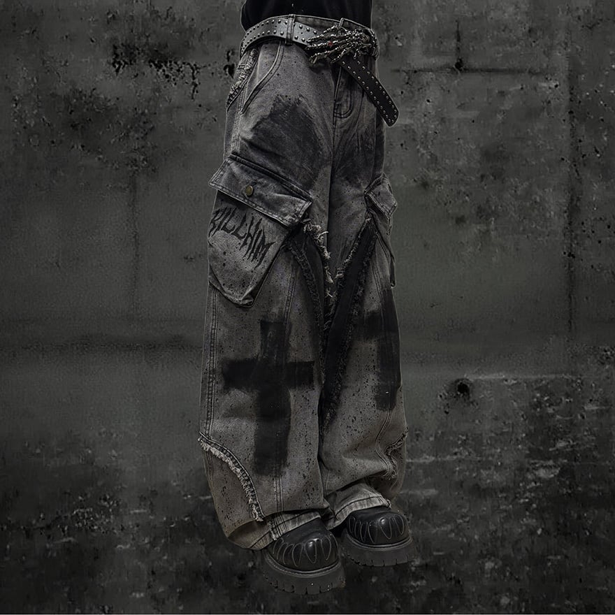 全体にウォッシュ加工とペイントスプラッター、十字架グラフィティを施したグレーのワイドカーゴデニムパンツです。太腿部分の大型カーゴポケットとフリンジダメージがパンクらしい反骨感を加え、極太のシルエットがゴシックストリートコーデに圧倒的な存在感をもたらします。