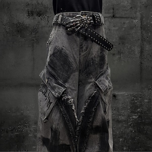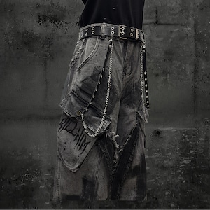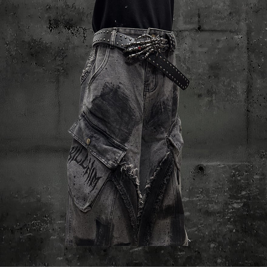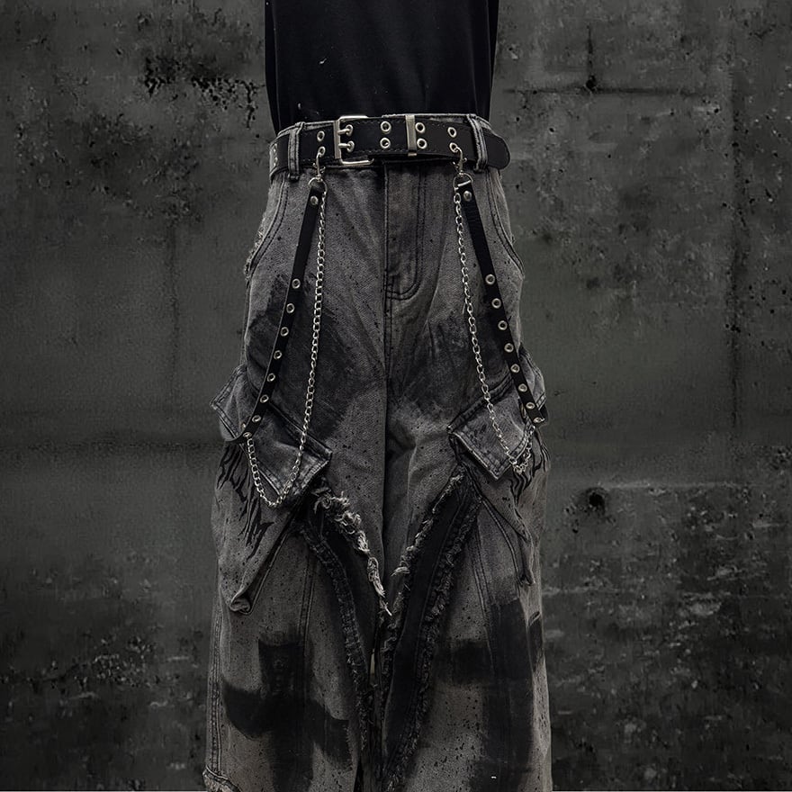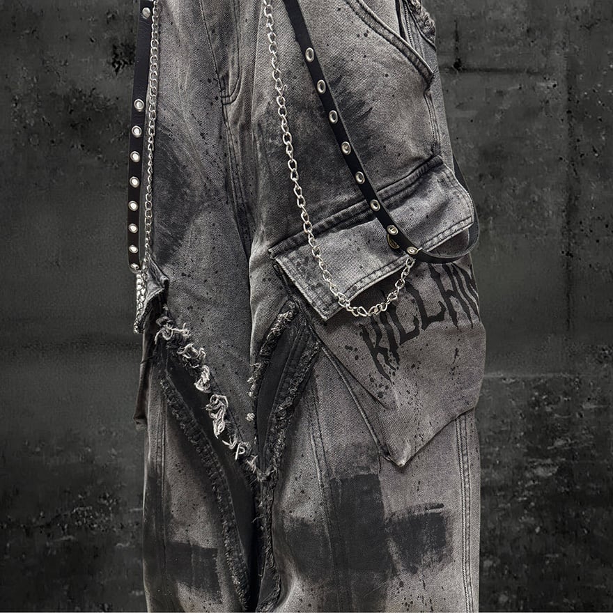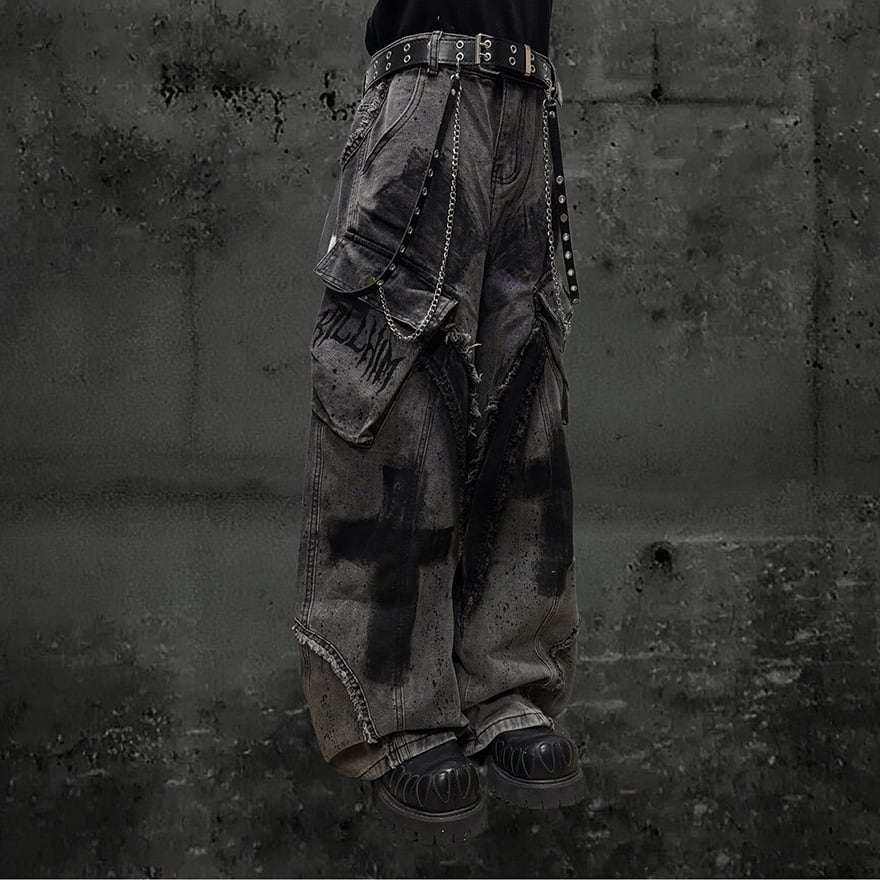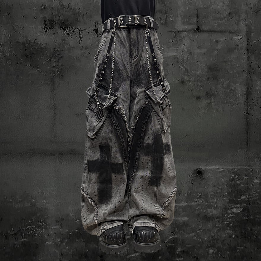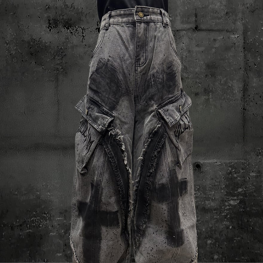 全体にウォッシュ加工とペイントスプラッター、十字架グラフィティを施したグレーのワイドカーゴデニムパンツです。太腿部分の大型カーゴポケットとフリンジダメージがパンクらしい反骨感を加え、極太のシルエットがゴシックストリートコーデに圧倒的な存在感をもたらします。