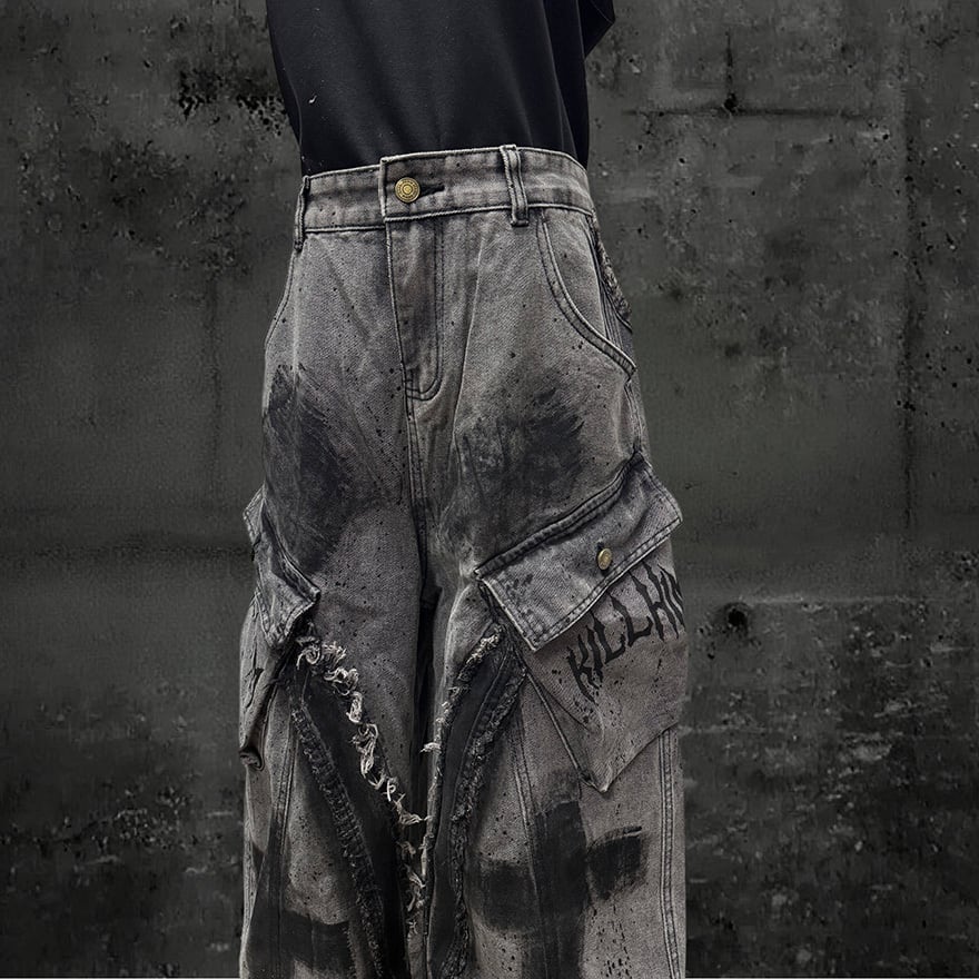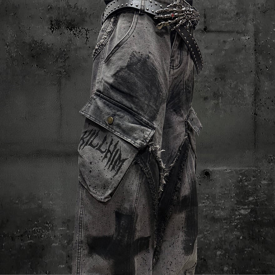 グレーのデニム地全体にウォッシュ加工が施され、墨を引いたような黒のペイントスプラッターと大きな十字架グラフィティが左右の裾にかけて配置されています。太腿の両サイドには蓋付きの大型カーゴポケットがあり、ポケット縁にはフリンジ状のほつれダメージが意図的に加えられています。裾にも細かなダメージが入り、穿き込んだような退廃的な質感が全体を貫いています。ハイウエストのウエストバンドにはゴールドトーンのボタンが備わり、無骨さの中にわずかなアクセントをもたらしています。